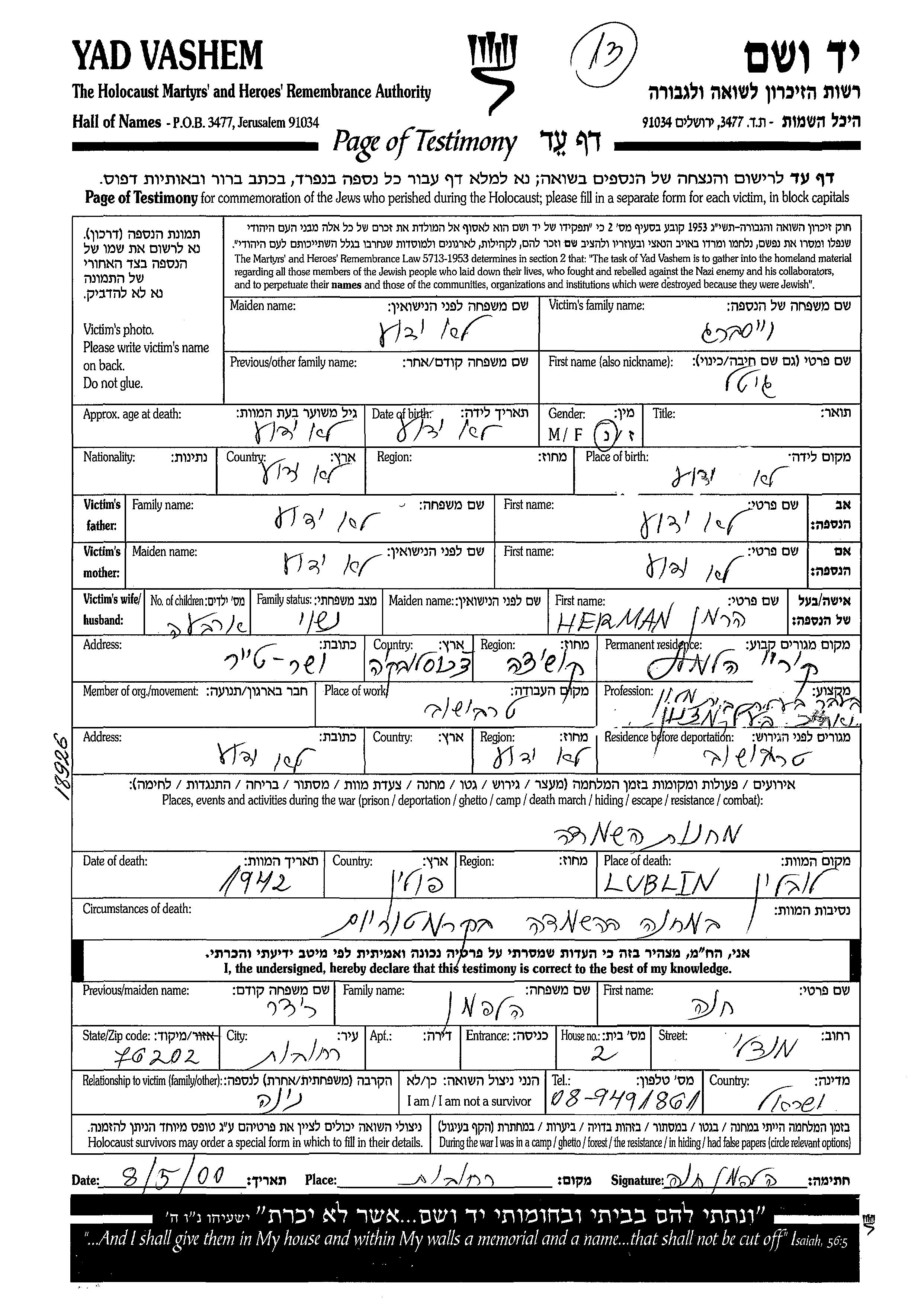 Gitel Veisberg. Sie war Hotel und mit Herman Verheiratet. Vor dem Zweiten Weltkrieg lebte sie in Kiraly Helmec, Tschechoslowakei. Während des Krieges war sie in Trebisov, Tschechoslowakei.