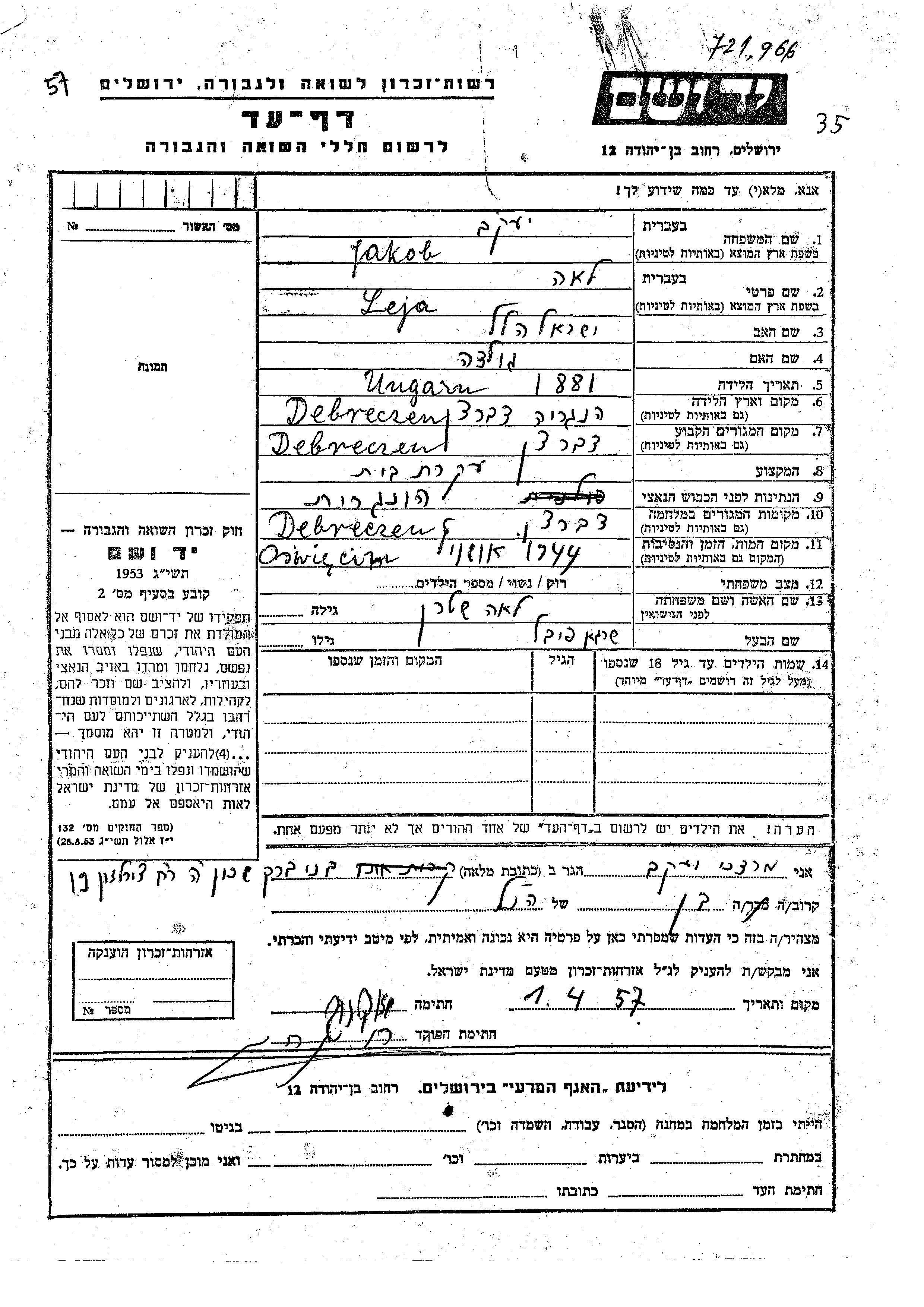 Leja Jakob, geb. Shtern wurde im Jahr 1881 in Debreczen, Ungarn geboren. Sie war die Tochter von Yisrael Hilel und Golda. Sie war Hausfrau und mit Shraga Feibel Verheiratet. Vor dem Zweiten Weltkrieg lebte sie in Debreczen, Ungarn. Während des Krieges war sie in Debreczen, Ungarn.