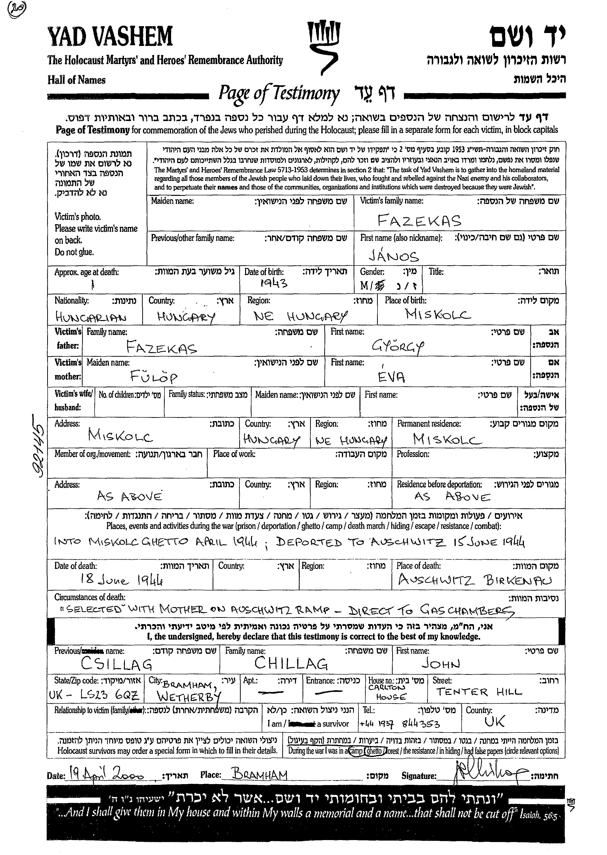 Janos wurde in der Schoah ermordet. Todesort: Birkenau, Polen im Jahr 1944.