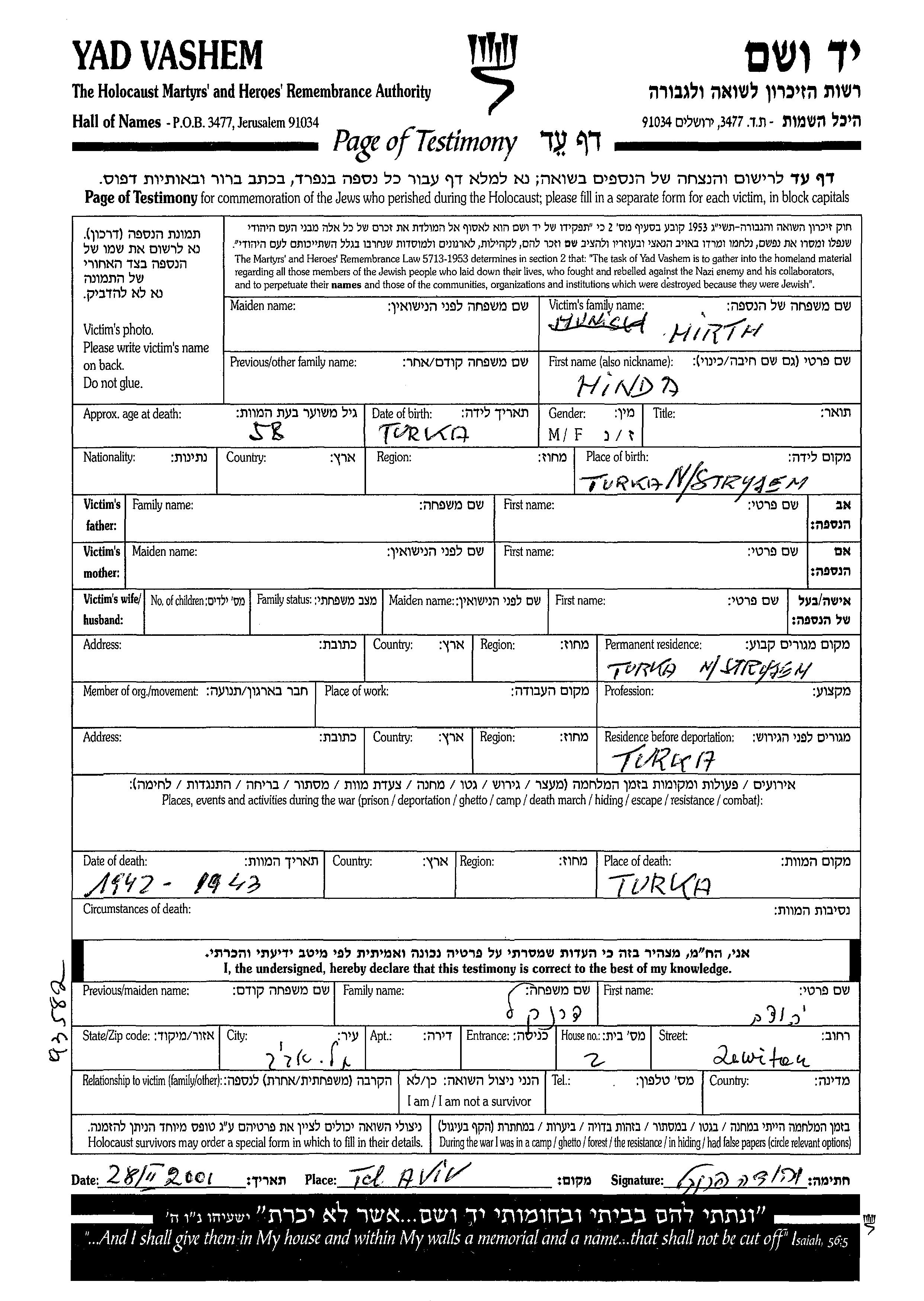 Hinda wurde in der Schoah ermordet. Todesort: Turka nad Stryjem, Polen im Jahr 1942.