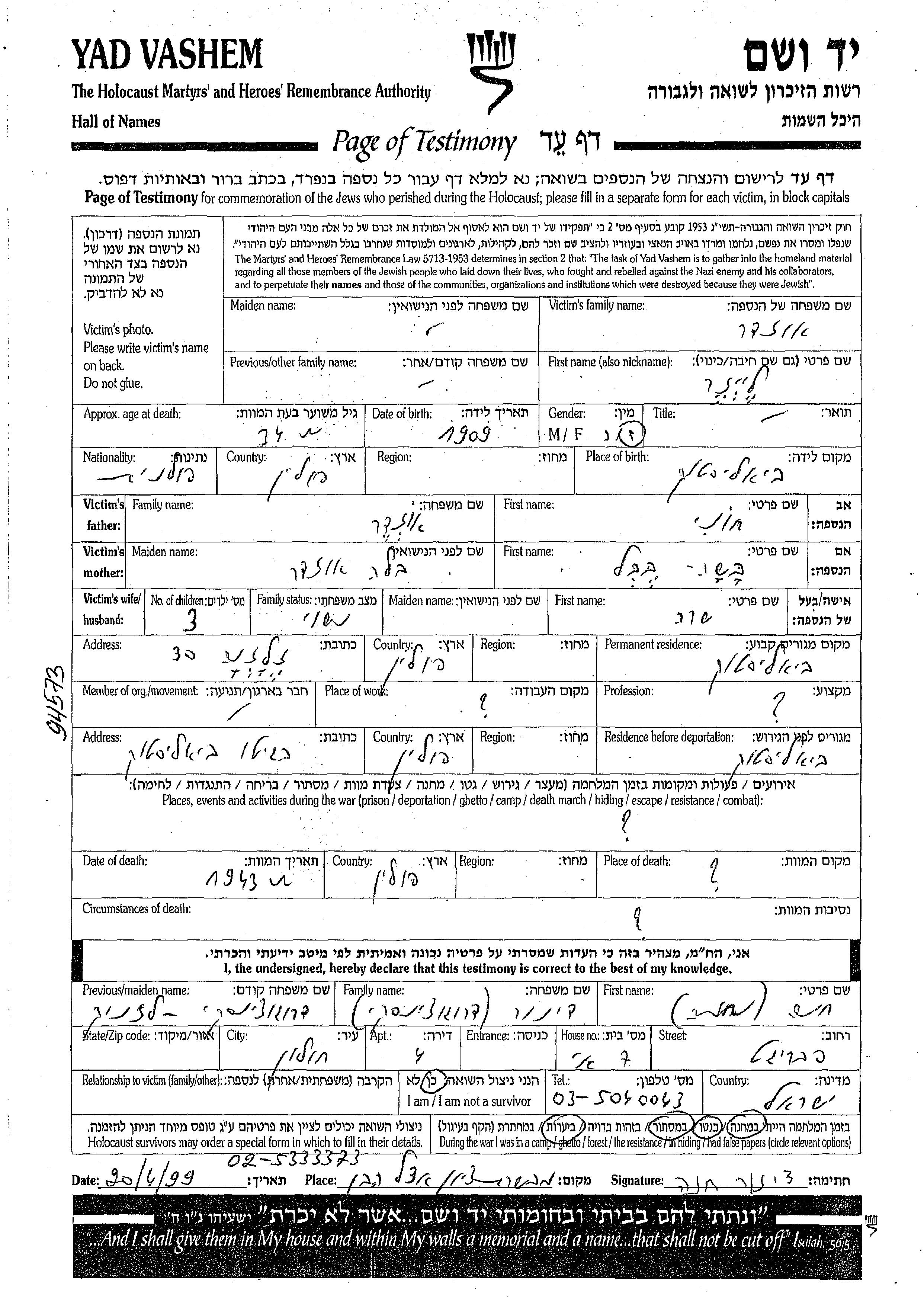 Leizer Ozder wurde im Jahr 1909 in Bialystok, Polen geboren. Er war der Sohn von Khoni und Basha Babel. Er war mit Sara Verheiratet. Vor dem Zweiten Weltkrieg lebte er in Bialystok, Polen. Während des Krieges war er in Bialystok, Polen.