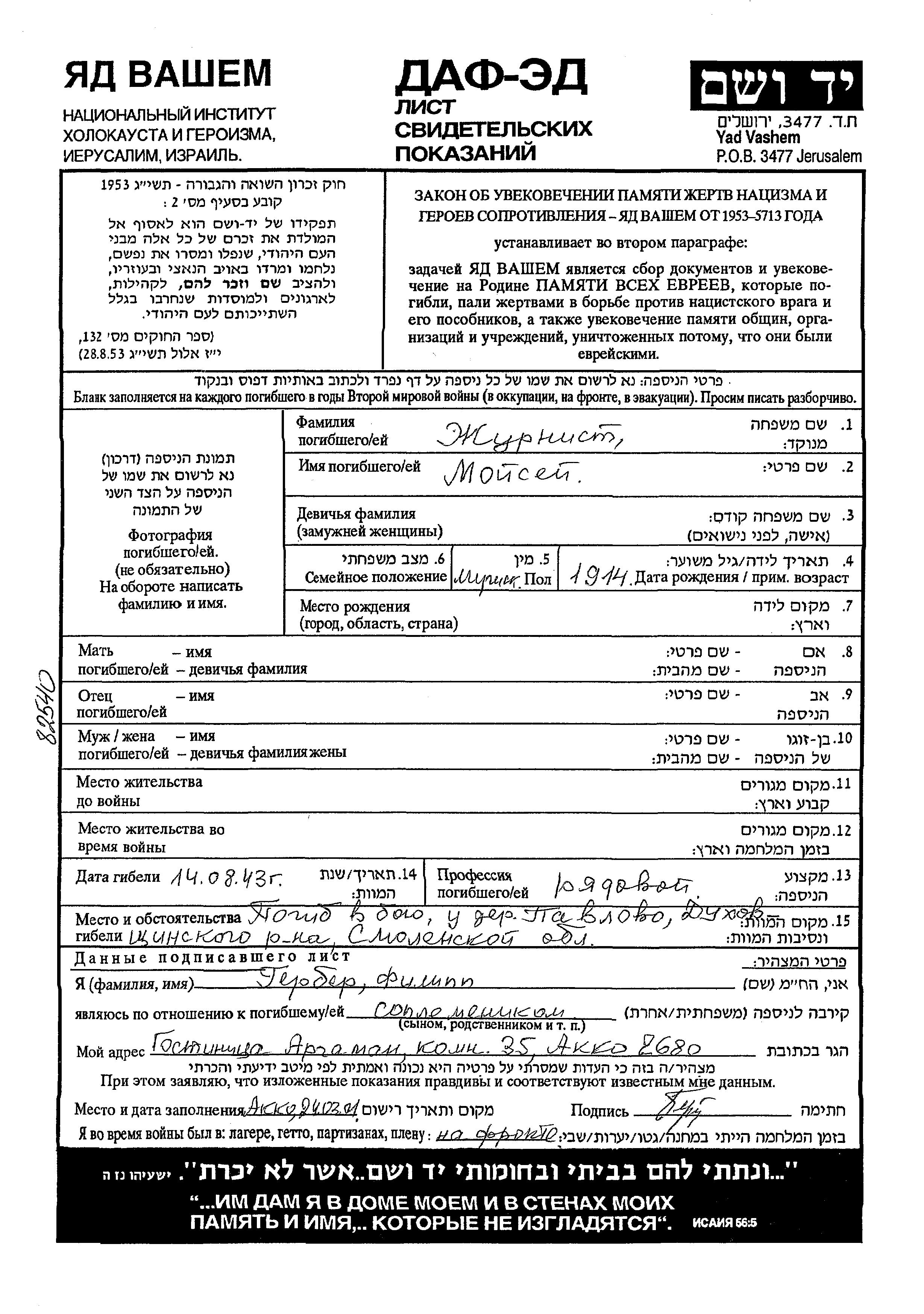 Moisei Zhurnist wurde im Jahr 1914 geboren. Er war Soldat. Während des Krieges war er in die Sowjetischen Streitkräfte. Moisei im Militärdienst umgekommen. Todesort: Pavlovo, Russland (UdSSR) im Jahr 1943.