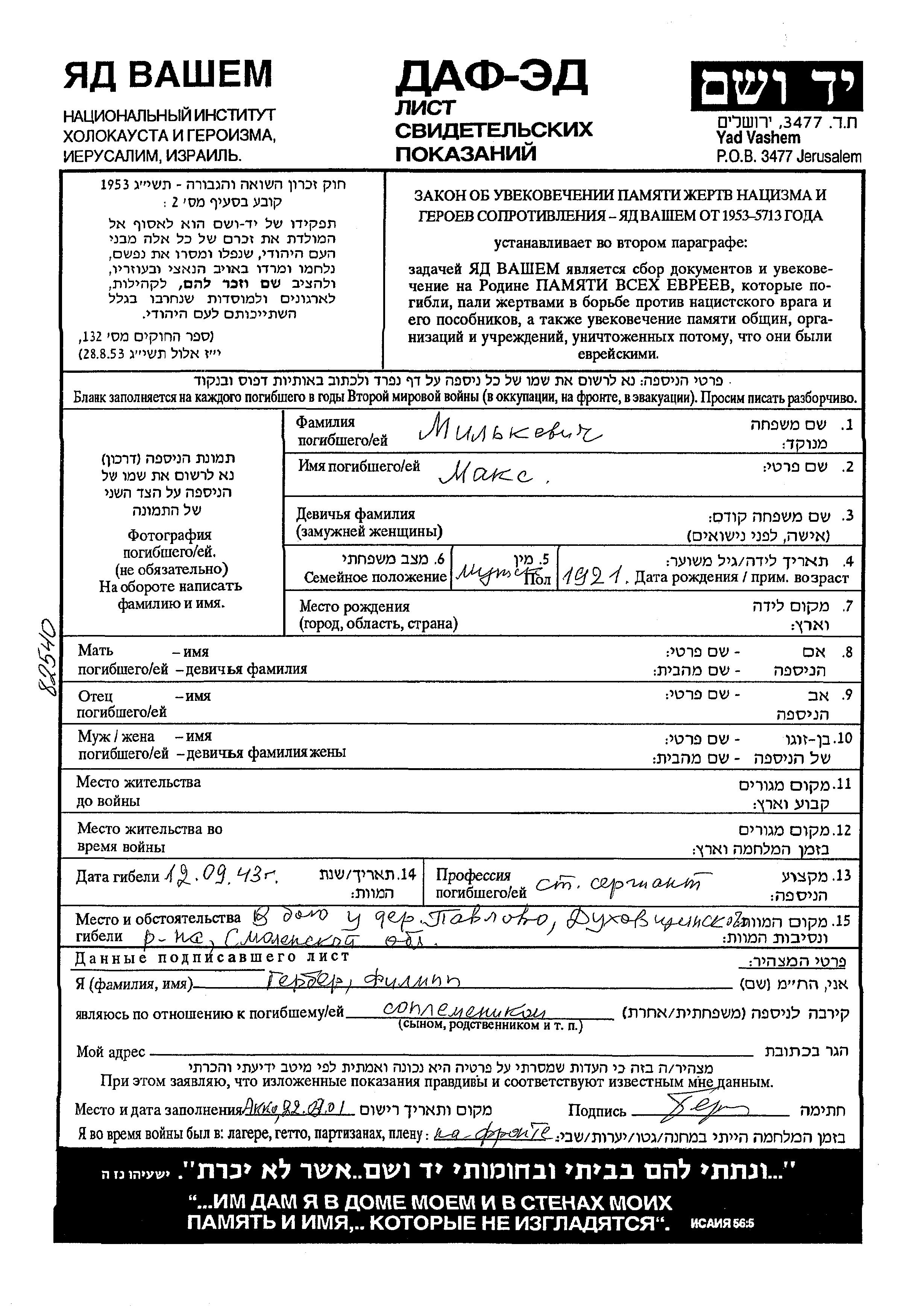 Max Milkevich wurde im Jahr 1921 geboren. Während des Krieges war er in die Sowjetischen Streitkräfte. Max im Militärdienst umgekommen. Todesort: Pavlovo, Russland (UdSSR) im Jahr 1943.