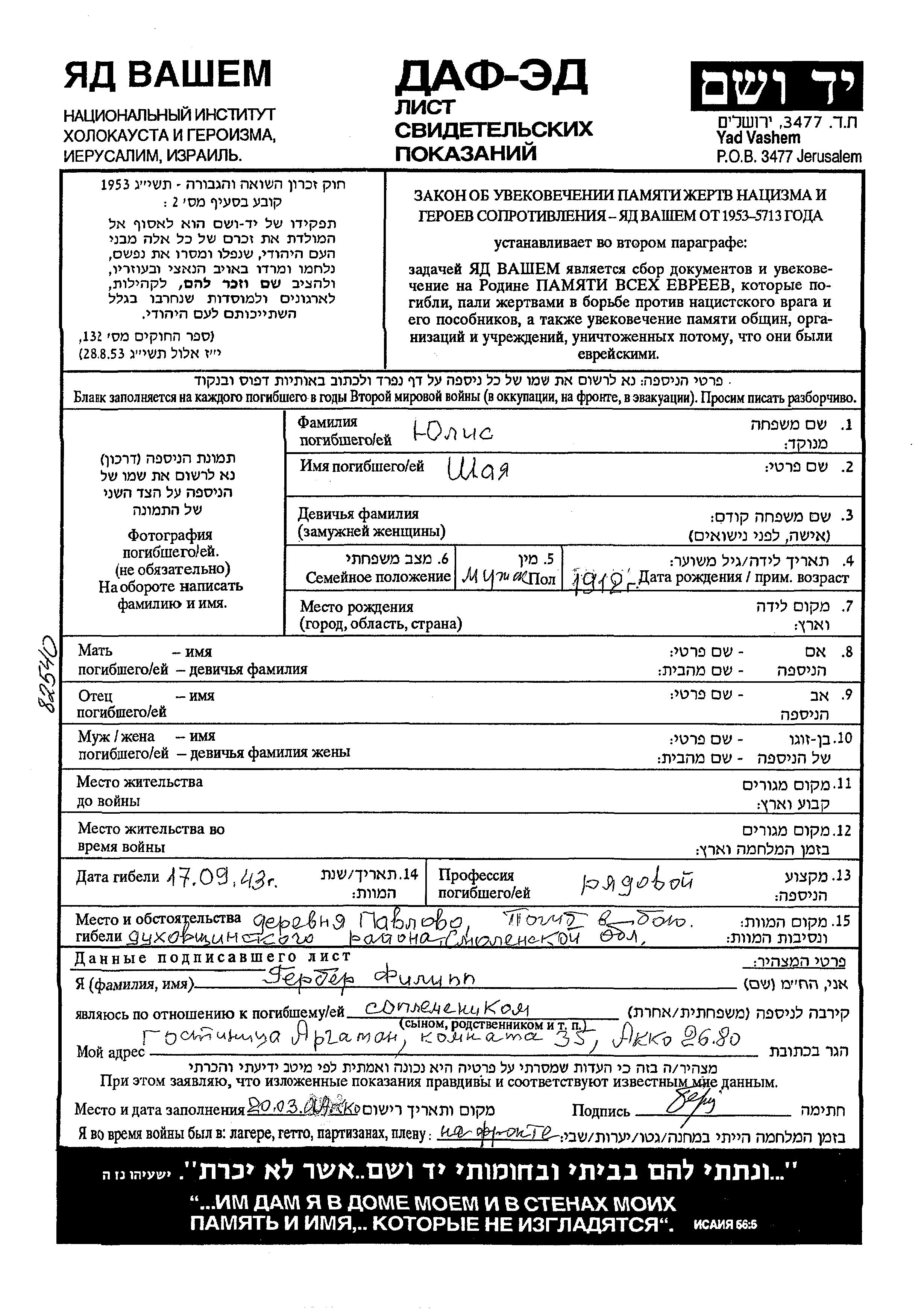 Shaya Yulis wurde im Jahr 1912 geboren. Er war Soldat. Während des Krieges war er in die Sowjetischen Streitkräfte. Shaya im Militärdienst umgekommen. Todesort: Pavlovo, Russland (UdSSR) im Jahr 1943.