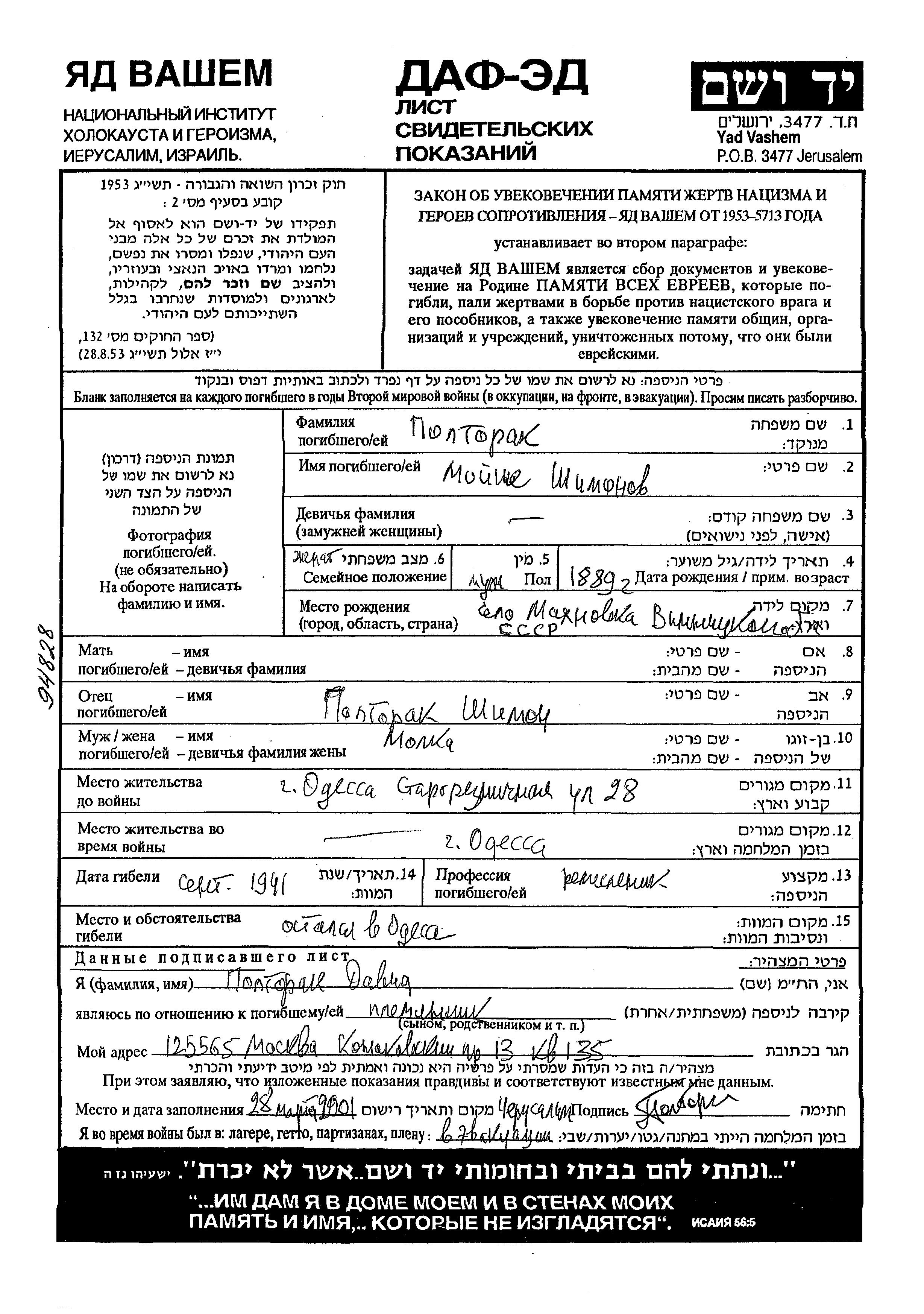Poltorak Moishe 1889 Odessa, Ukraine (UdSSR) Gedenkblatt