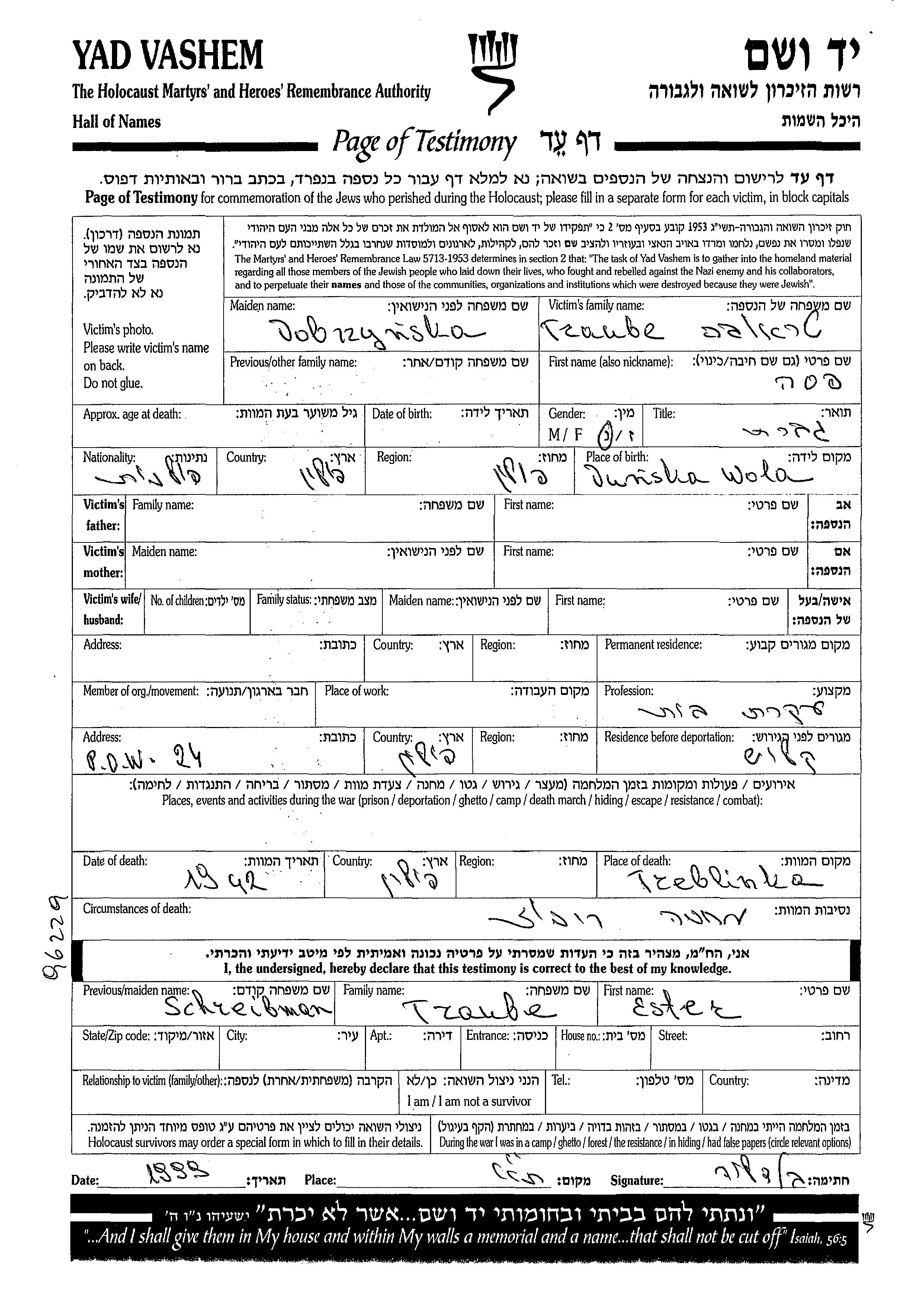 Pesa Traube, geb. Dobrzynska wurde in Dunska Wola, Polen geboren. Sie war Hausfrau. Während des Krieges war sie in Kalusz, Polen.
