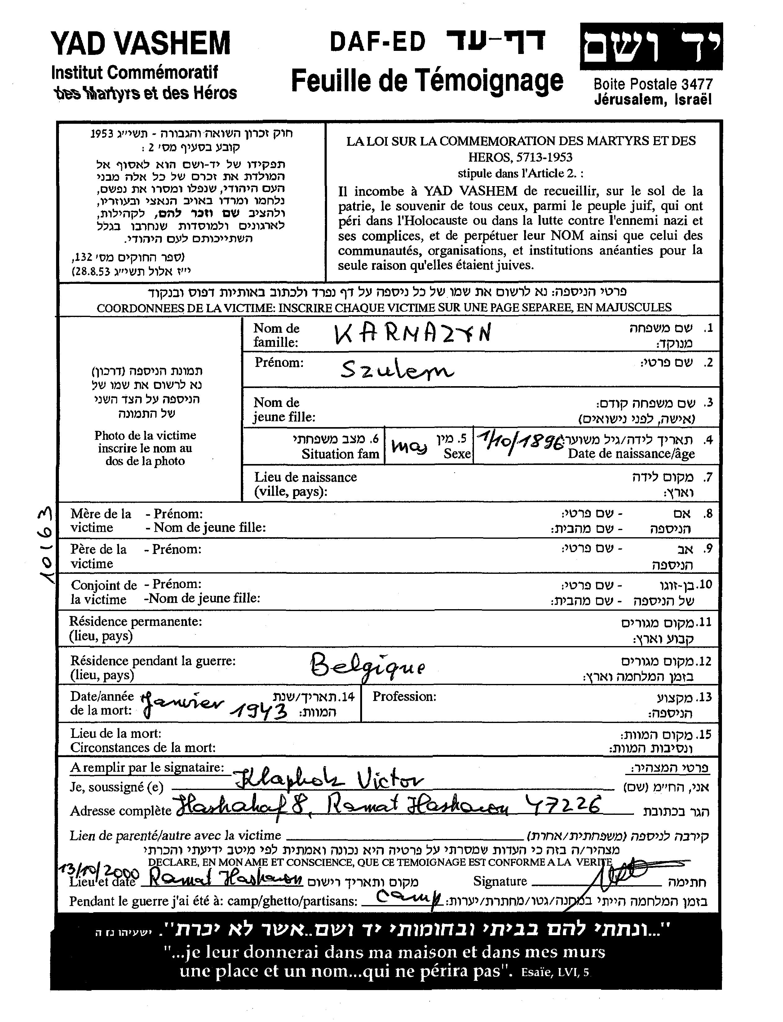 Szulem wurde in der Schoah ermordet. Todesort: unbekannt im Jahr 1943.