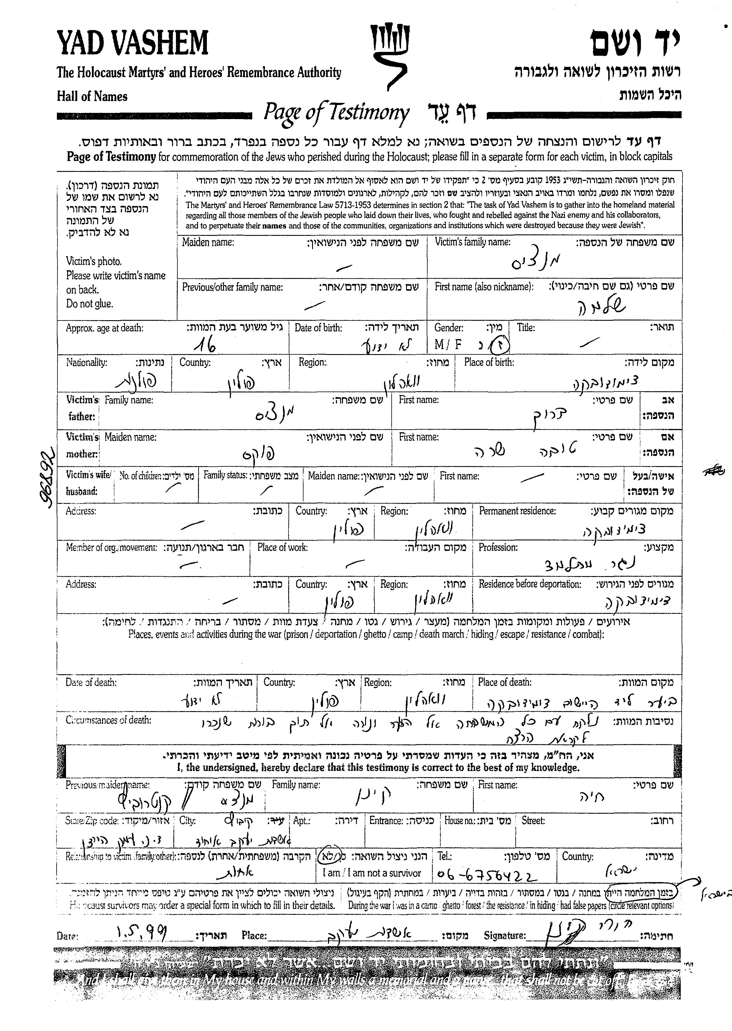 Shlomo Manzis wurde in Demidovka, Polen geboren. Er war der Sohn von Barukh und Tova Sara. Er war Zimmerlehrling. Vor dem Zweiten Weltkrieg lebte er in Demidovka, Polen. Während des Krieges war er in Demidovka, Polen.