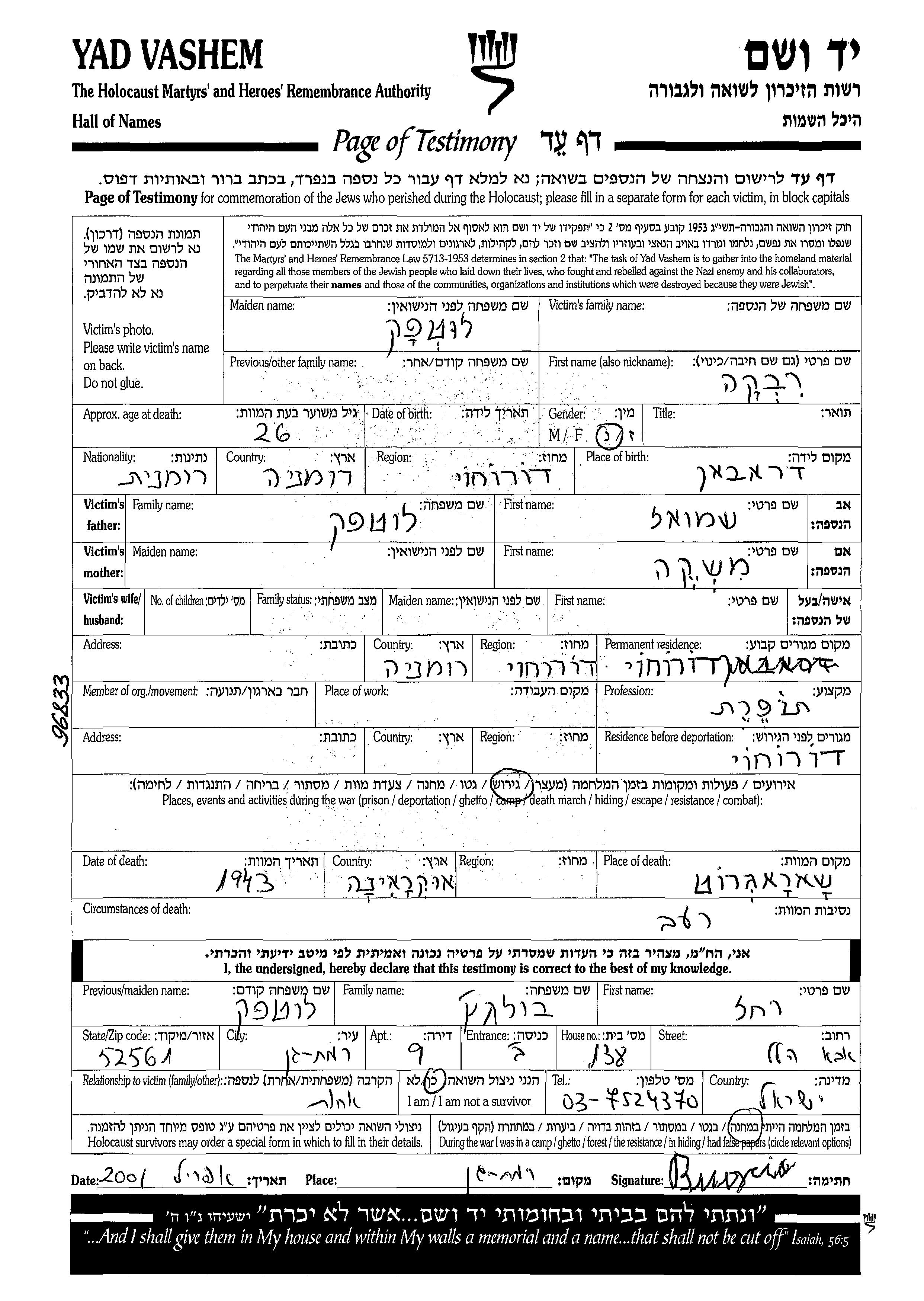 Lutfak Rivka Dorohoi, Rumänien Gedenkblatt