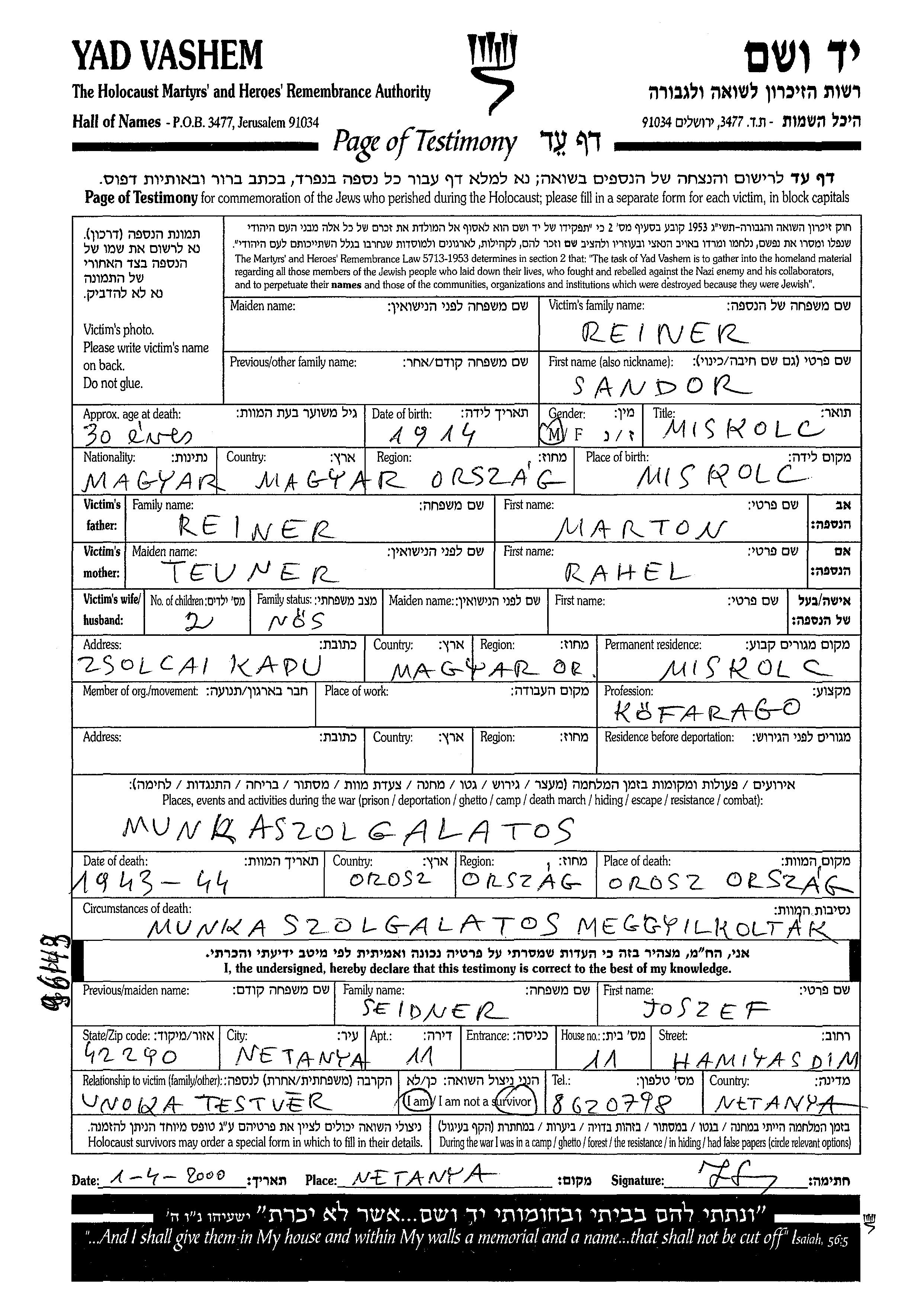 Sandor Reiner wurde im Jahr 1914 in Miskolc, Ungarn geboren. Er war der Sohn von Marton und Rahel. Er war Kofarago und Verheiratet. Vor dem Zweiten Weltkrieg lebte er in Miskolc, Ungarn. Während des Krieges war er in Miskolc, Ungarn.