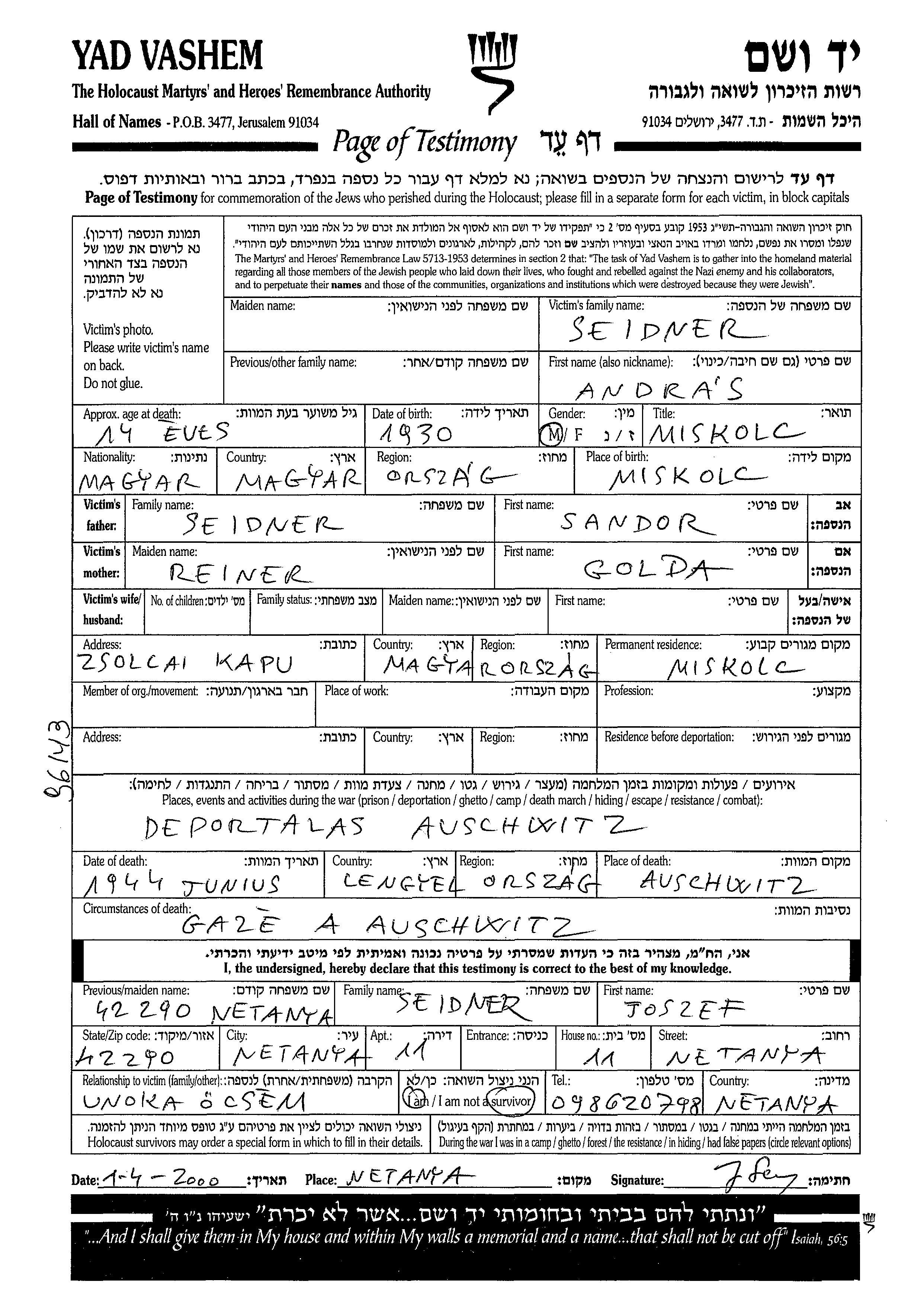 Seidner Andras 1930 Miskolc, Ungarn Gedenkblatt