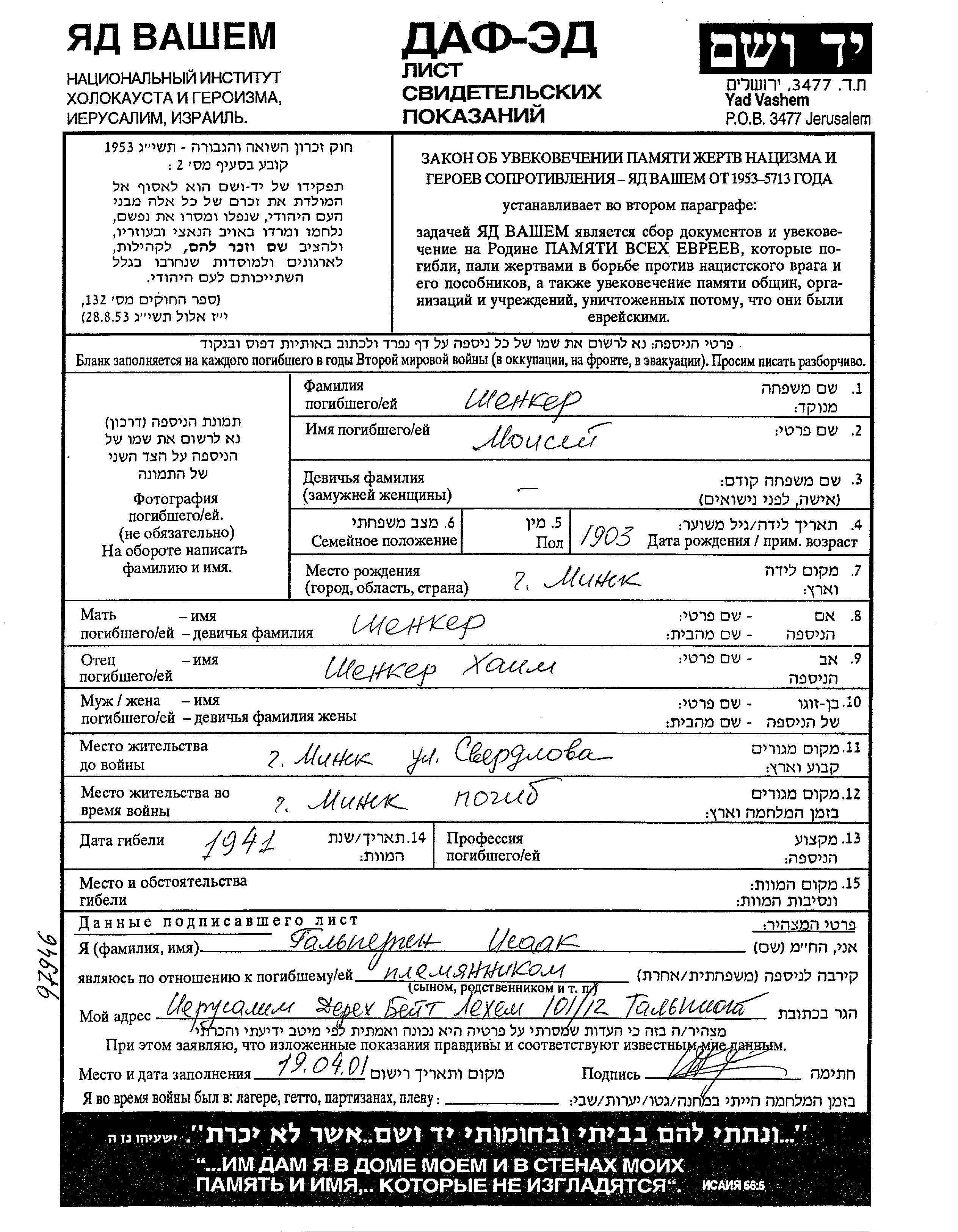 Moisei Shenker wurde im Jahr 1903 in Minsk, Weißrussland (UdSSR) geboren. Er war der Sohn von Khaim. Vor dem Zweiten Weltkrieg lebte er in Minsk, Weißrussland (UdSSR). Während des Krieges war er in Minsk, Weißrussland (UdSSR).