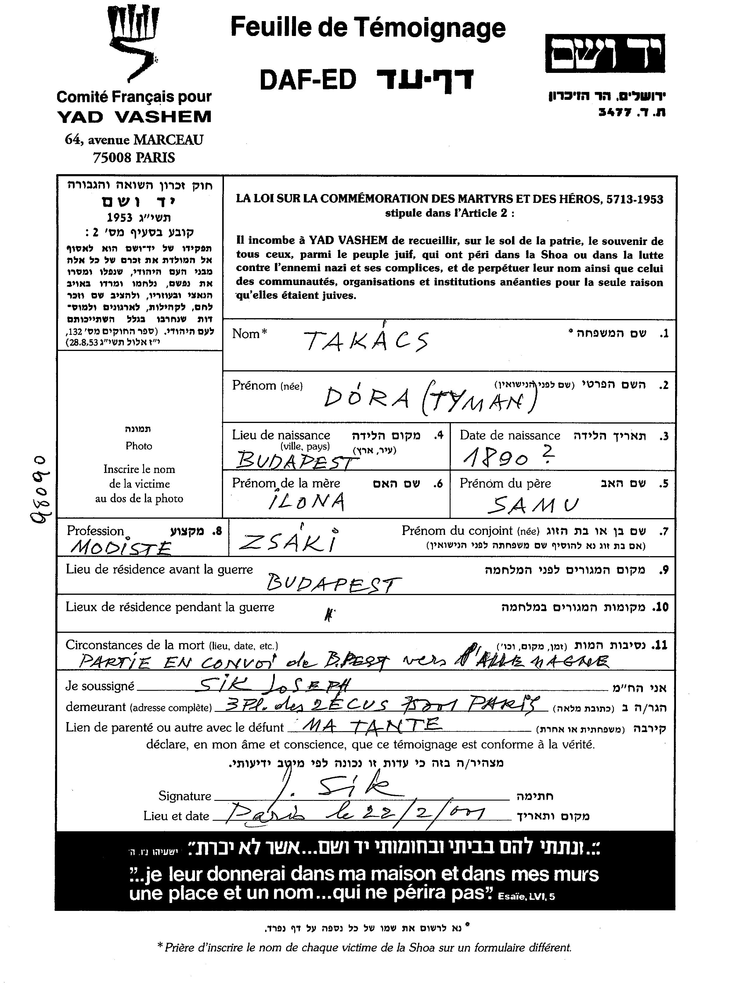 Dora Takacs, geb. Tyman wurde im Jahr 1890 in Budapest, Ungarn geboren. Sie war die Tochter von Samu und Ilona. Sie war Modistin. Vor dem Zweiten Weltkrieg lebte sie in Budapest, Ungarn. Während des Krieges war sie in Budapest, Ungarn.