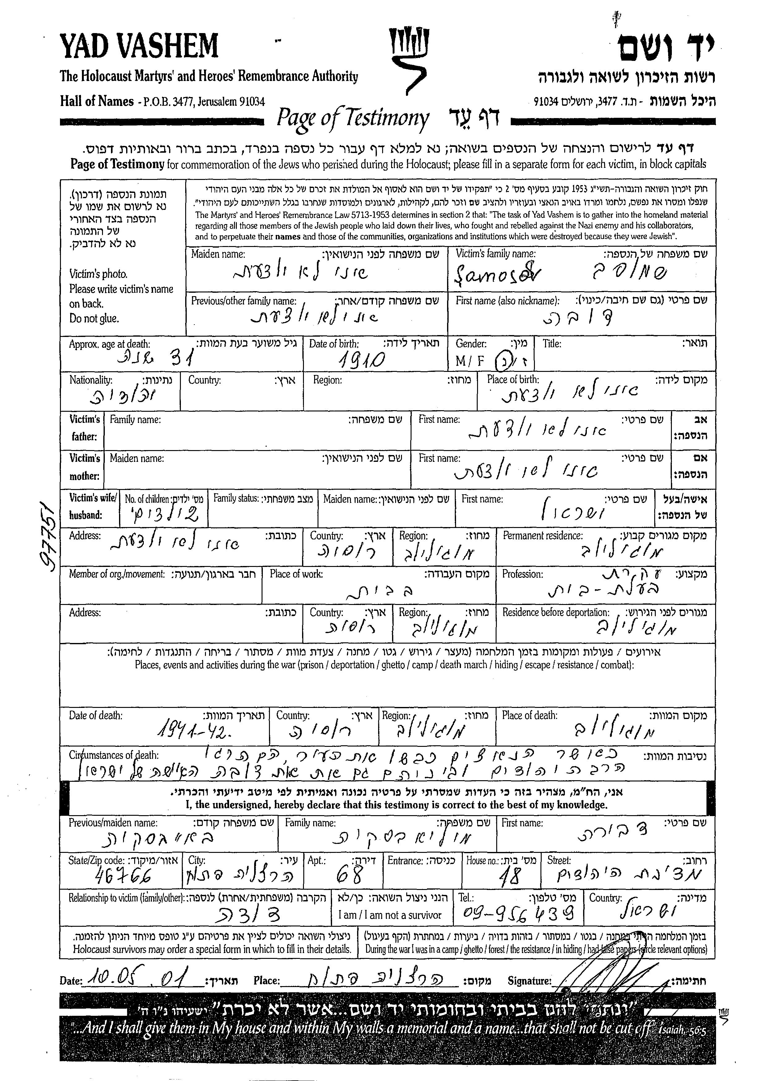 Doba Samosov wurde im Jahr 1910 geboren. Sie war Hausfrau und mit Yisrael Verheiratet. Vor dem Zweiten Weltkrieg lebte sie in Mogilev, Weißrussland (UdSSR). Während des Krieges war sie in Mogilev, Weißrussland (UdSSR).