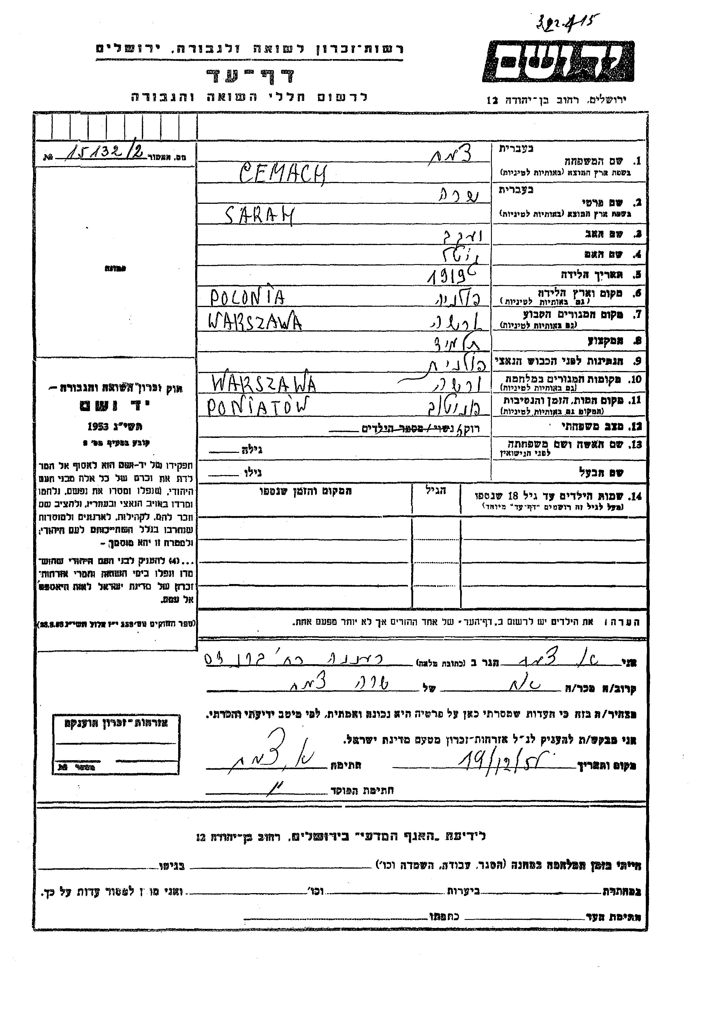Sarah Cemach wurde im Jahr 1919 in Polen geboren. Sie war die Tochter von Yaakov und Gitel. Sie war Schüler/-in und Ledig. Vor dem Zweiten Weltkrieg lebte sie in Warszawa, Polen. Während des Krieges war sie in Warszawa, Polen.