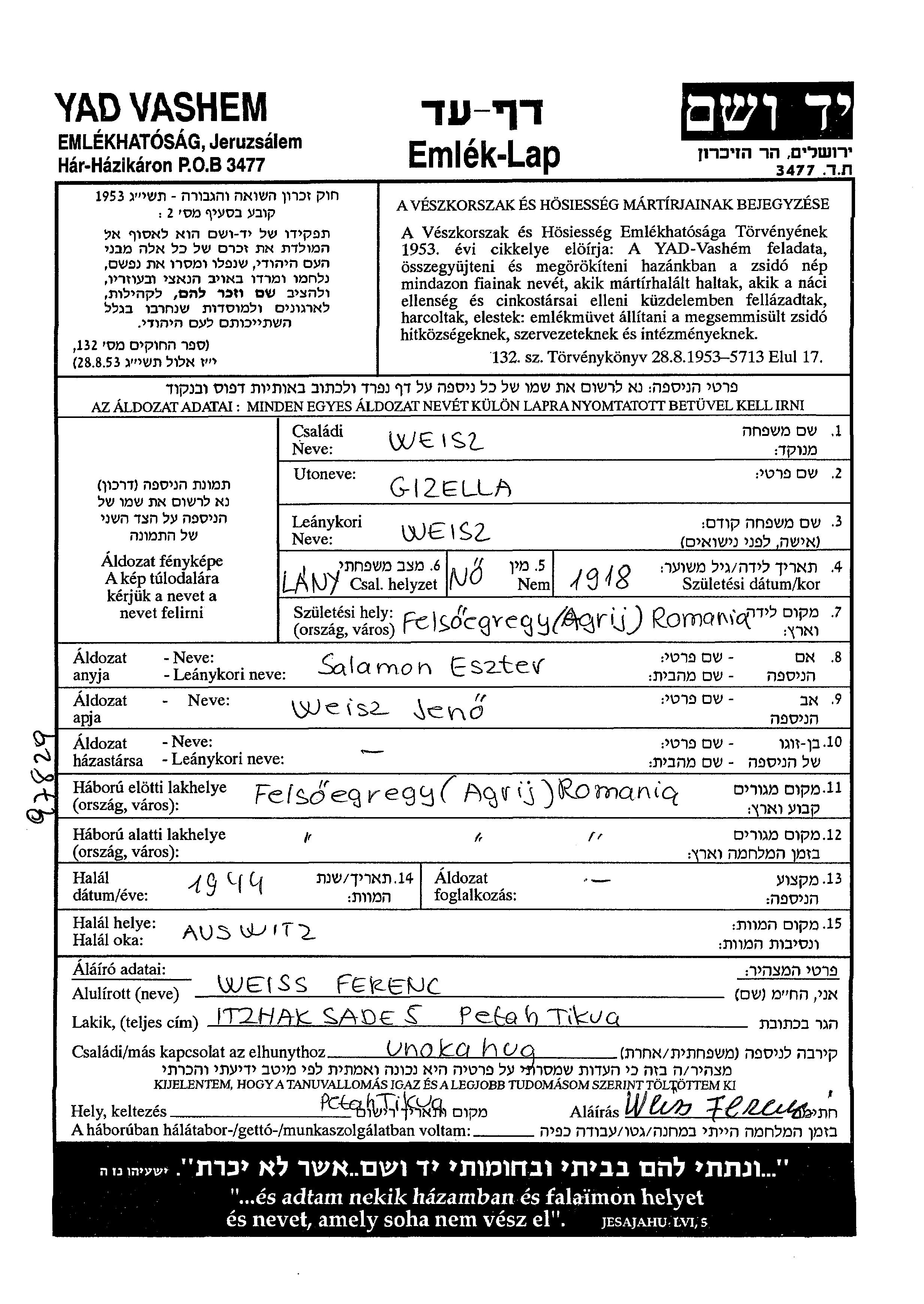 Gizella Weisz wurde im Jahr 1918 in Felsoegregy, Rumänien geboren. Sie war die Tochter von Jeno und Eszter. Sie war Kind. Vor dem Zweiten Weltkrieg lebte sie in Felsoegregy, Rumänien. Während des Krieges war sie in Felsoegregy, Rumänien.