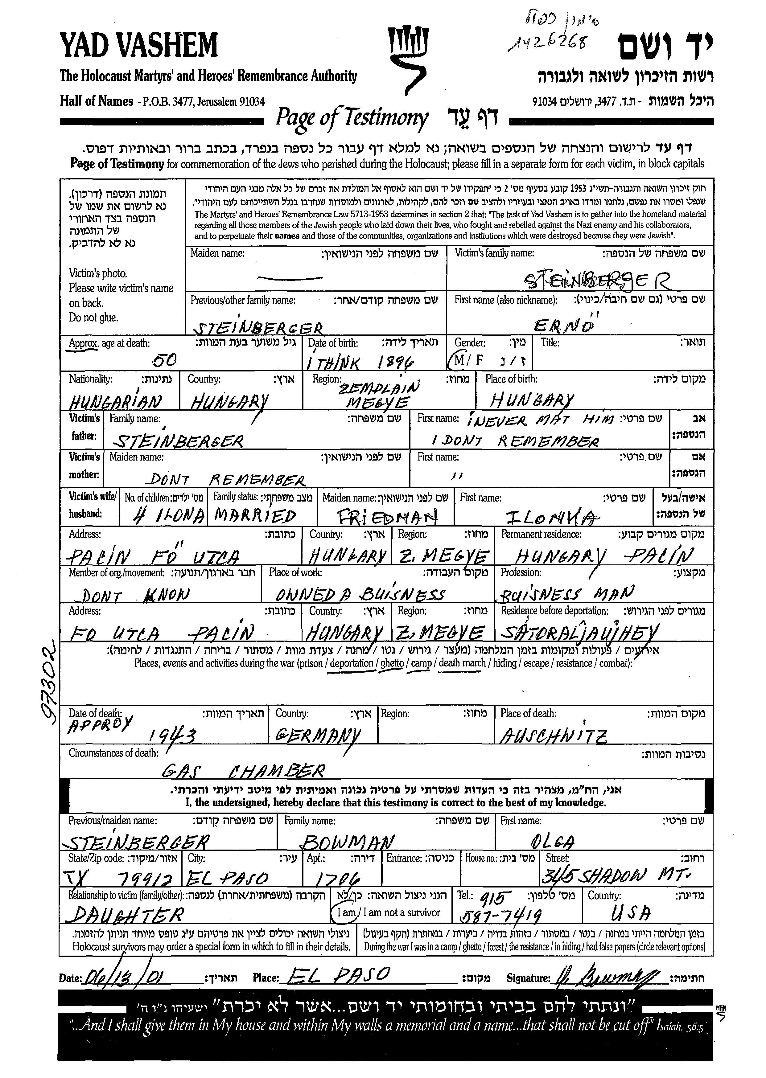 Erno Steinberger wurde im Jahr 1894 in Zemplen, Tschechoslowakei geboren. Er war Geschäftsmann und mit Ilonka, geb. Friedman Verheiratet. Vor dem Zweiten Weltkrieg lebte er in Pacin, Ungarn. Während des Krieges war er in Satoraljaujhely, Ungarn.