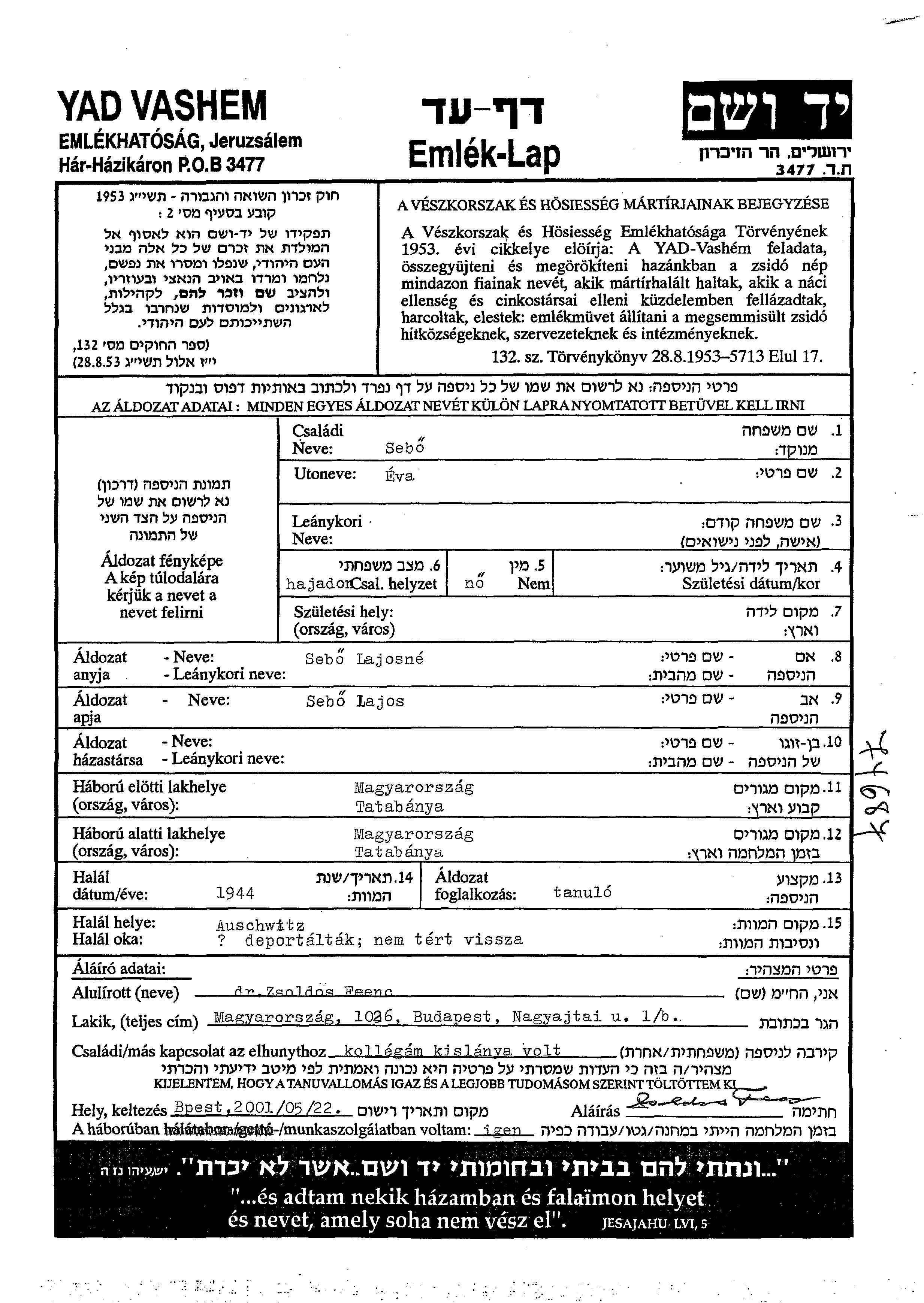 Eva Sebo wurde Sie war die Tochter von Lajos. Sie war Schüler/-in und Ledig. Vor dem Zweiten Weltkrieg lebte sie in Tatabanya, Ungarn. Während des Krieges war sie in Tatabanya, Ungarn.