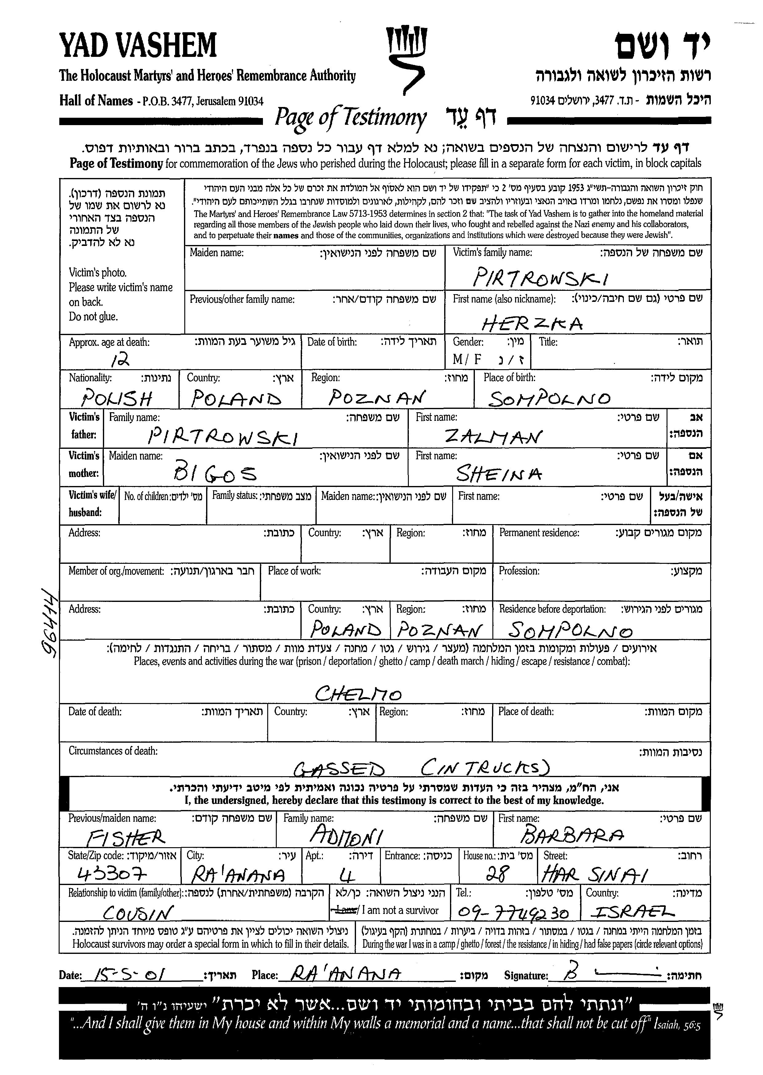 Herzka wurde in der Schoah ermordet. Todesort: Chelmno, Polen.