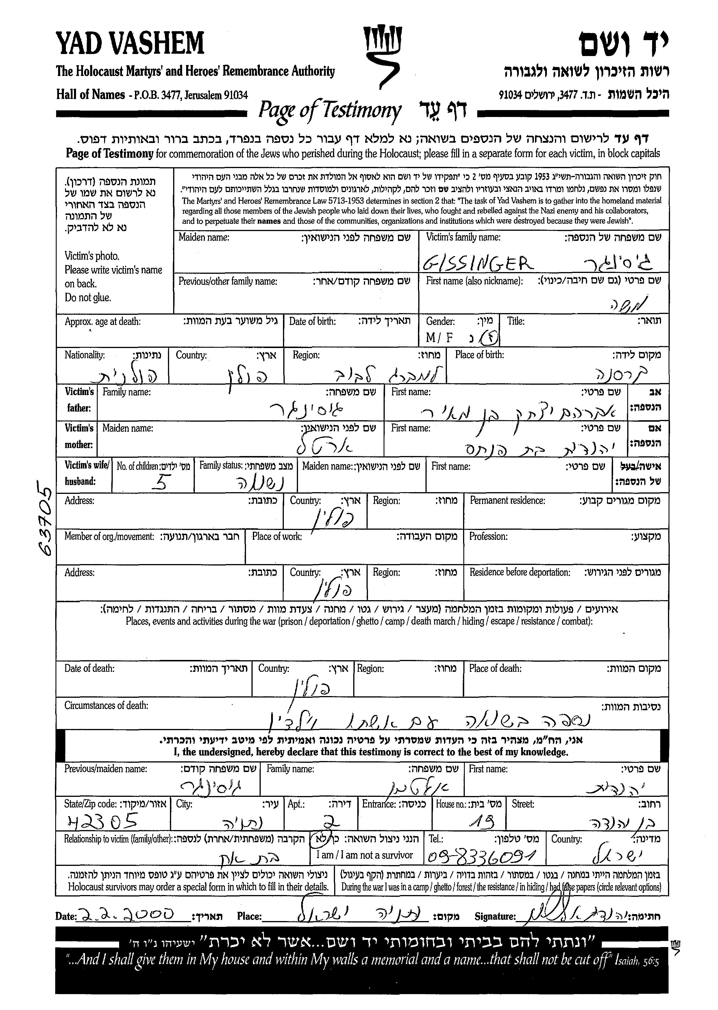 Moshe Gissinger wurde in Krasna, Polen geboren. Er war der Sohn von Avraham Yitzkhak und Yehudit. Vor dem Zweiten Weltkrieg lebte er in Polen. Während des Krieges war er in Polen.