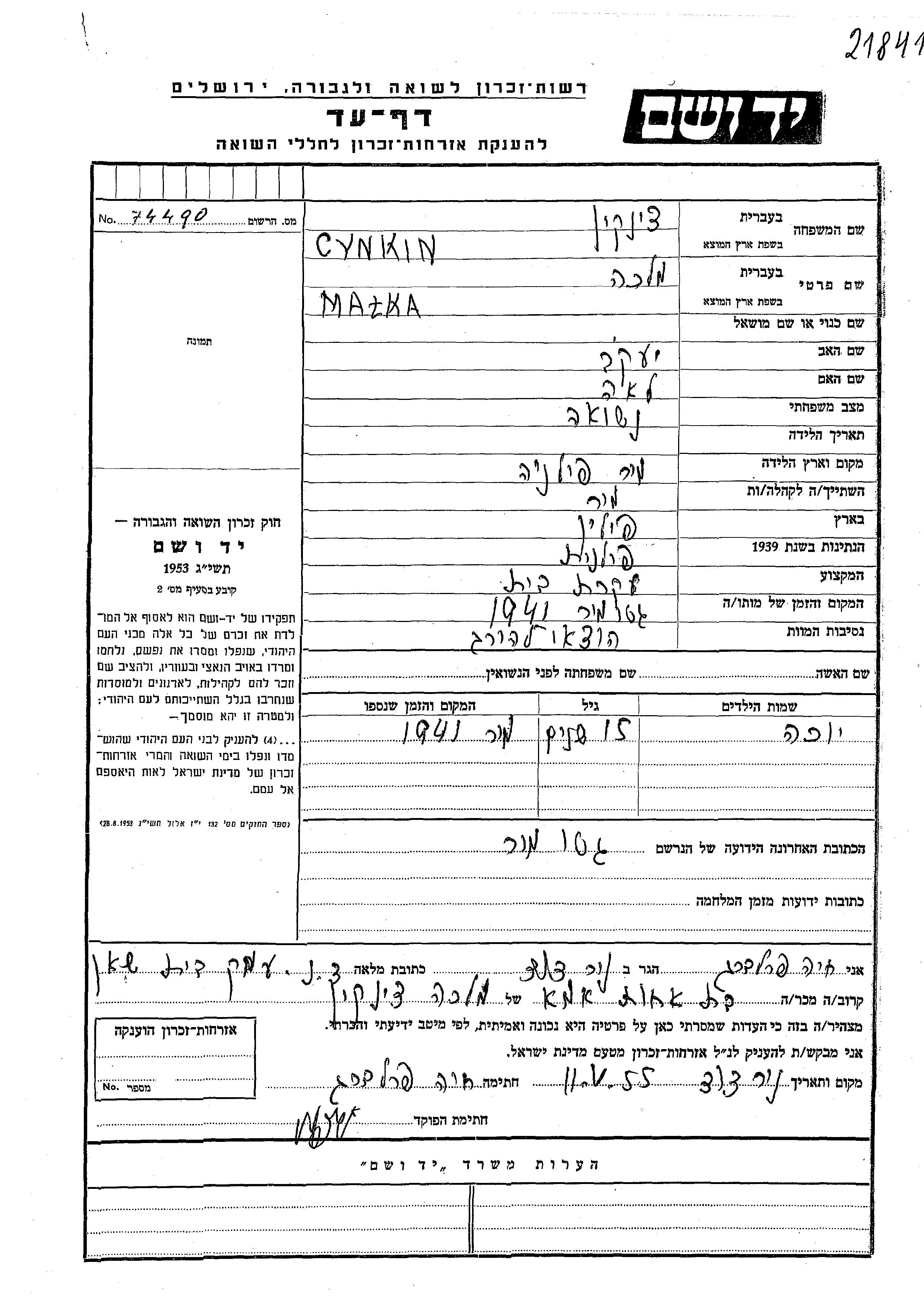 Malka Cynkin wurde in Mir, Polen geboren. Sie war die Tochter von Yaakov und Lea. Sie war Hausfrau und Verheiratet.