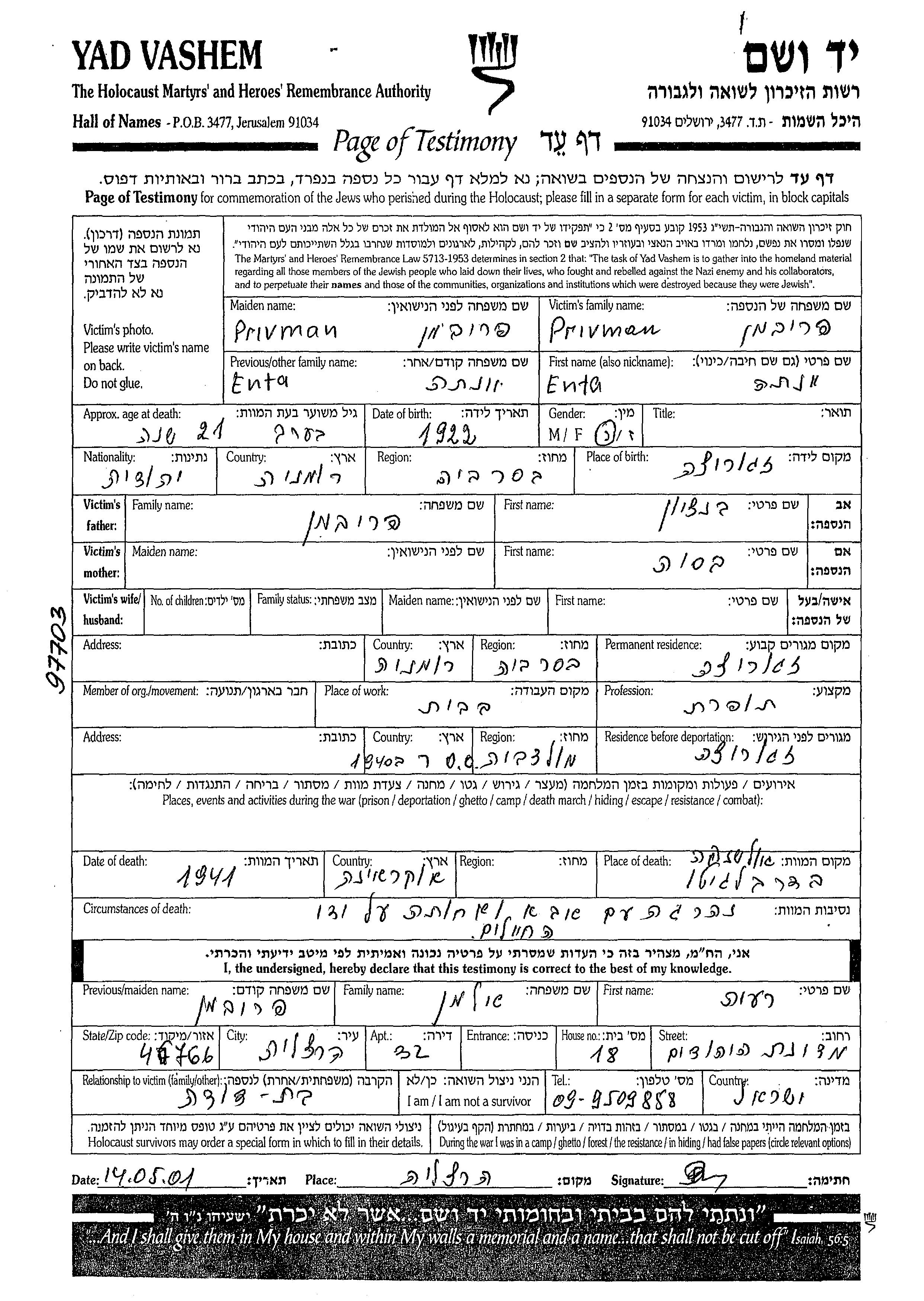 Yenta Privman wurde im Jahr 1922 in Zgurita, Rumänien geboren. Sie war die Tochter von Bentzion und Basya. Sie war Schneiderin. Vor dem Zweiten Weltkrieg lebte sie in Zgurita, Rumänien. Während des Krieges war sie in Zgurita, Rumänien.