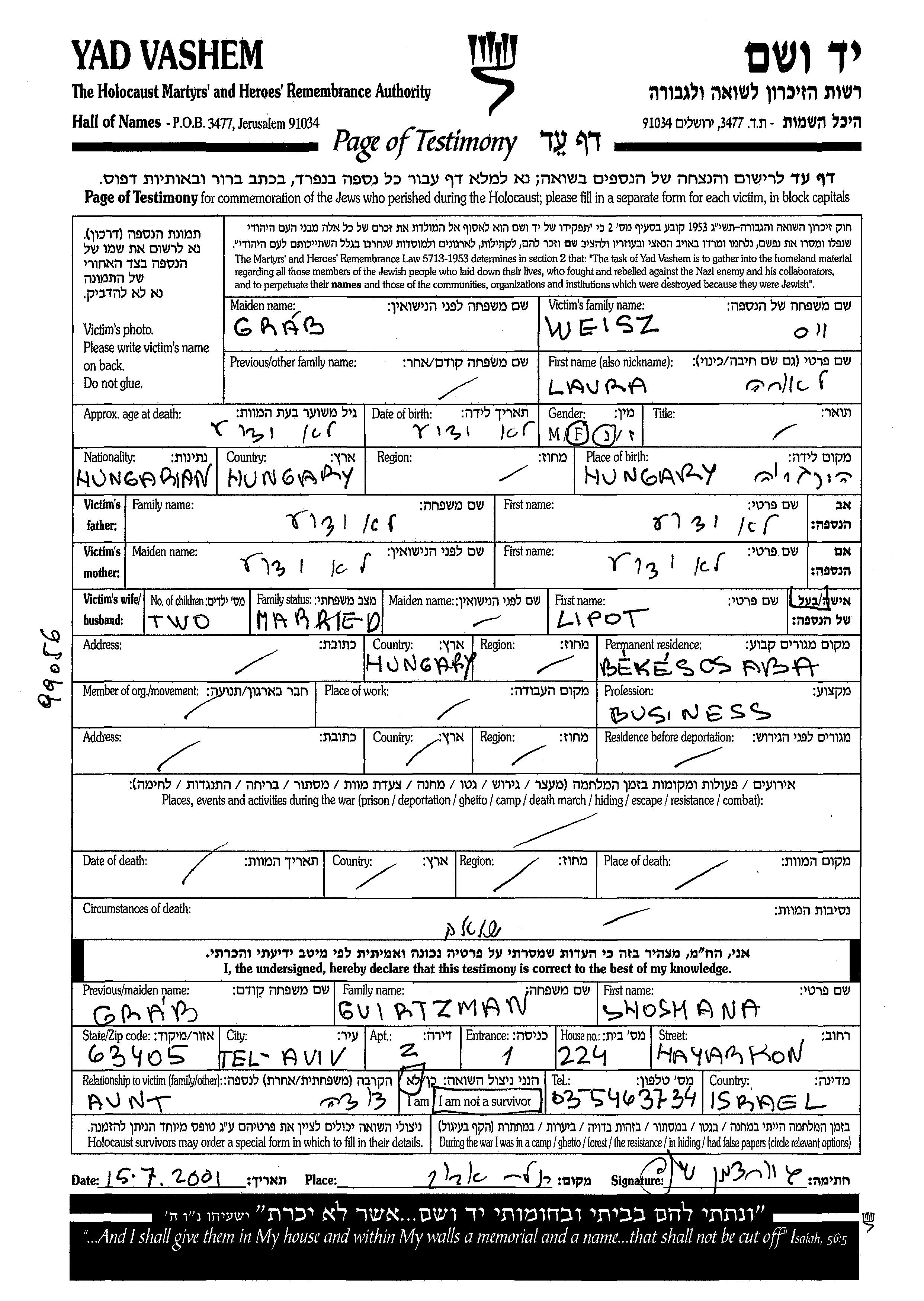 Weisz Laura Békéscsaba, Ungarn Gedenkblatt