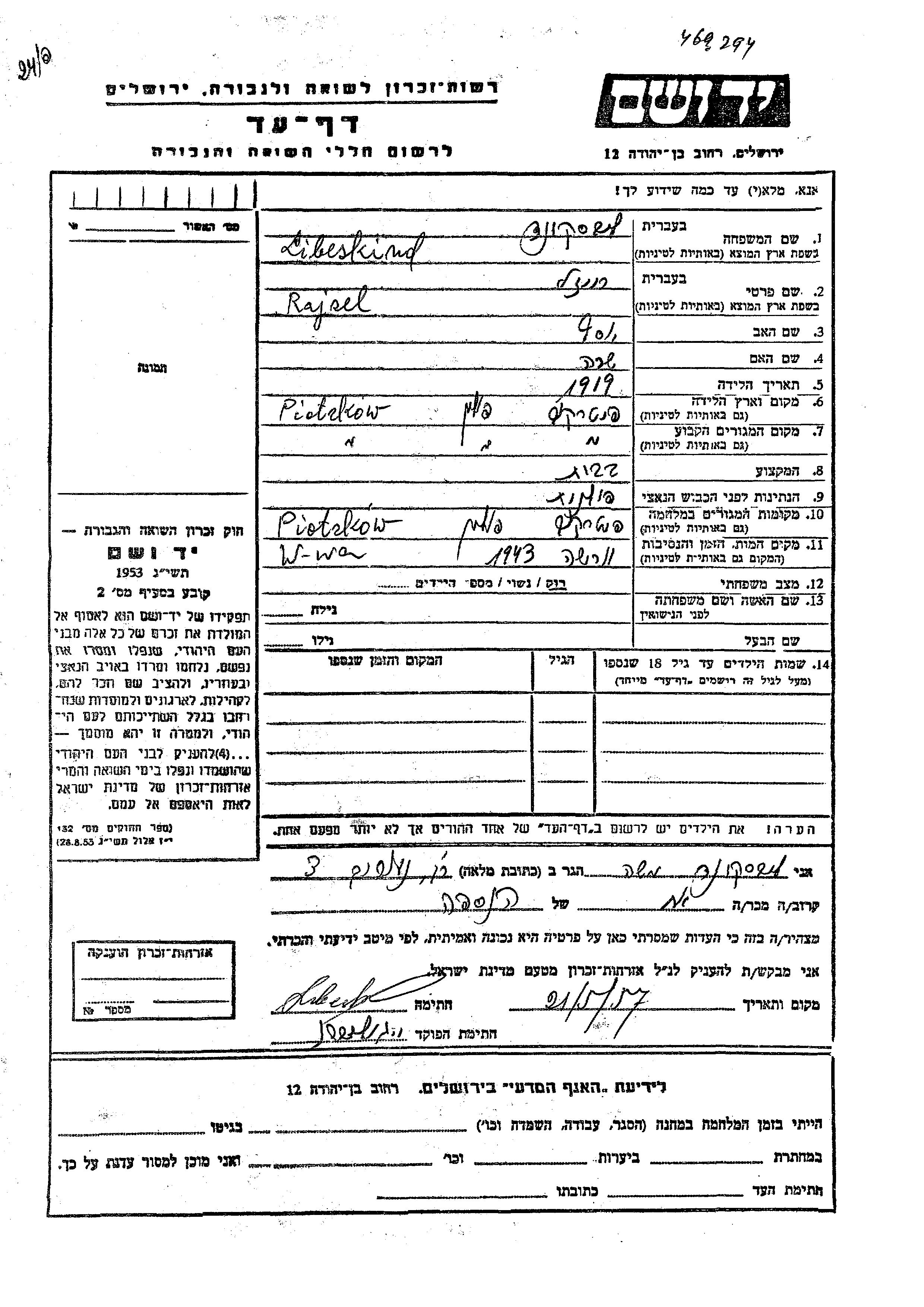 Rajzel Libeskind wurde im Jahr 1919 in Piotrkow, Polen geboren. Sie war die Tochter von Yosef und Sara. Sie war Hausfrau und Ledig. Vor dem Zweiten Weltkrieg lebte sie in Piotrkow, Polen. Während des Krieges war sie in Piotrkow, Polen.