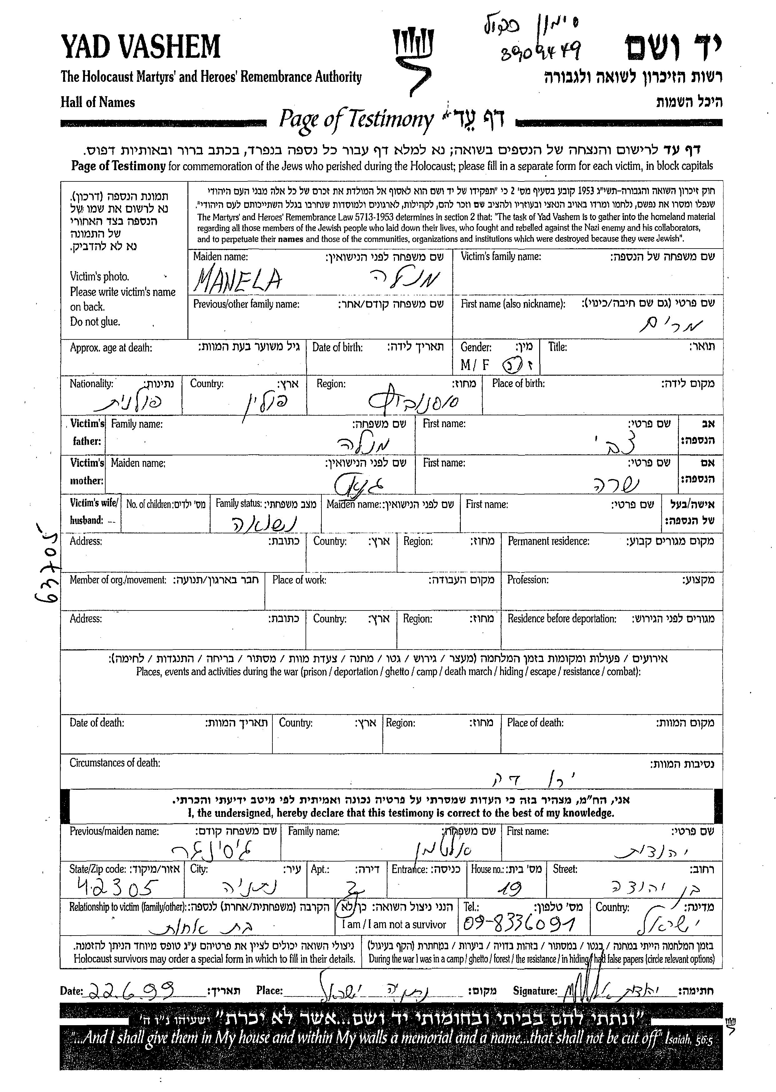 Miriam Name unbekannt, geb. Manela wurde in Sosnowiec, Polen geboren. Sie war die Tochter von Tzvi und Sara. Sie war Verheiratet.
