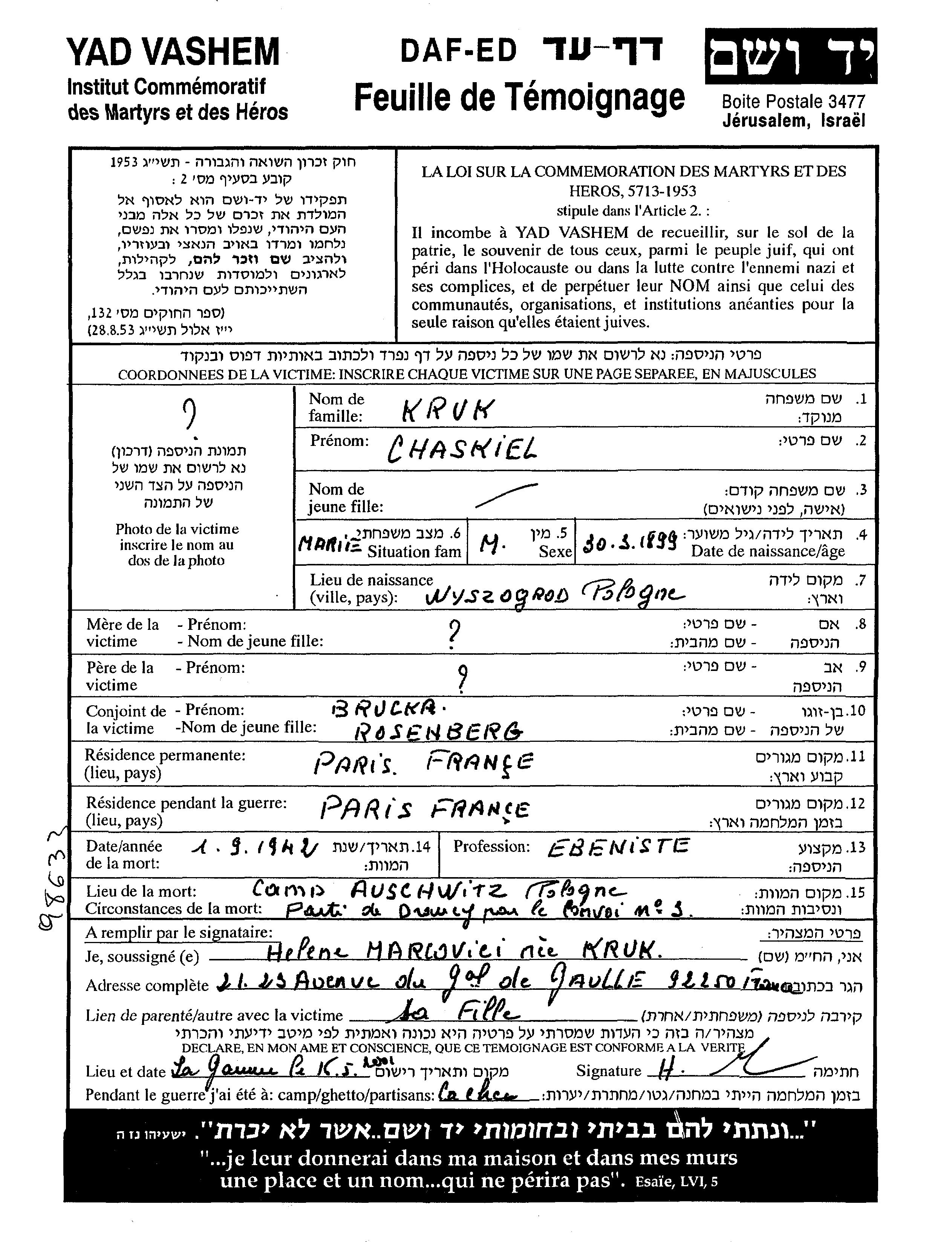 Chaskiel Kruk wurde im Jahr 1899 in Wyszogrod, Polen geboren. Er war Tischler und mit Brucka Verheiratet. Vor dem Zweiten Weltkrieg lebte er in Paris, Frankreich. Während des Krieges war er in Paris, Frankreich.