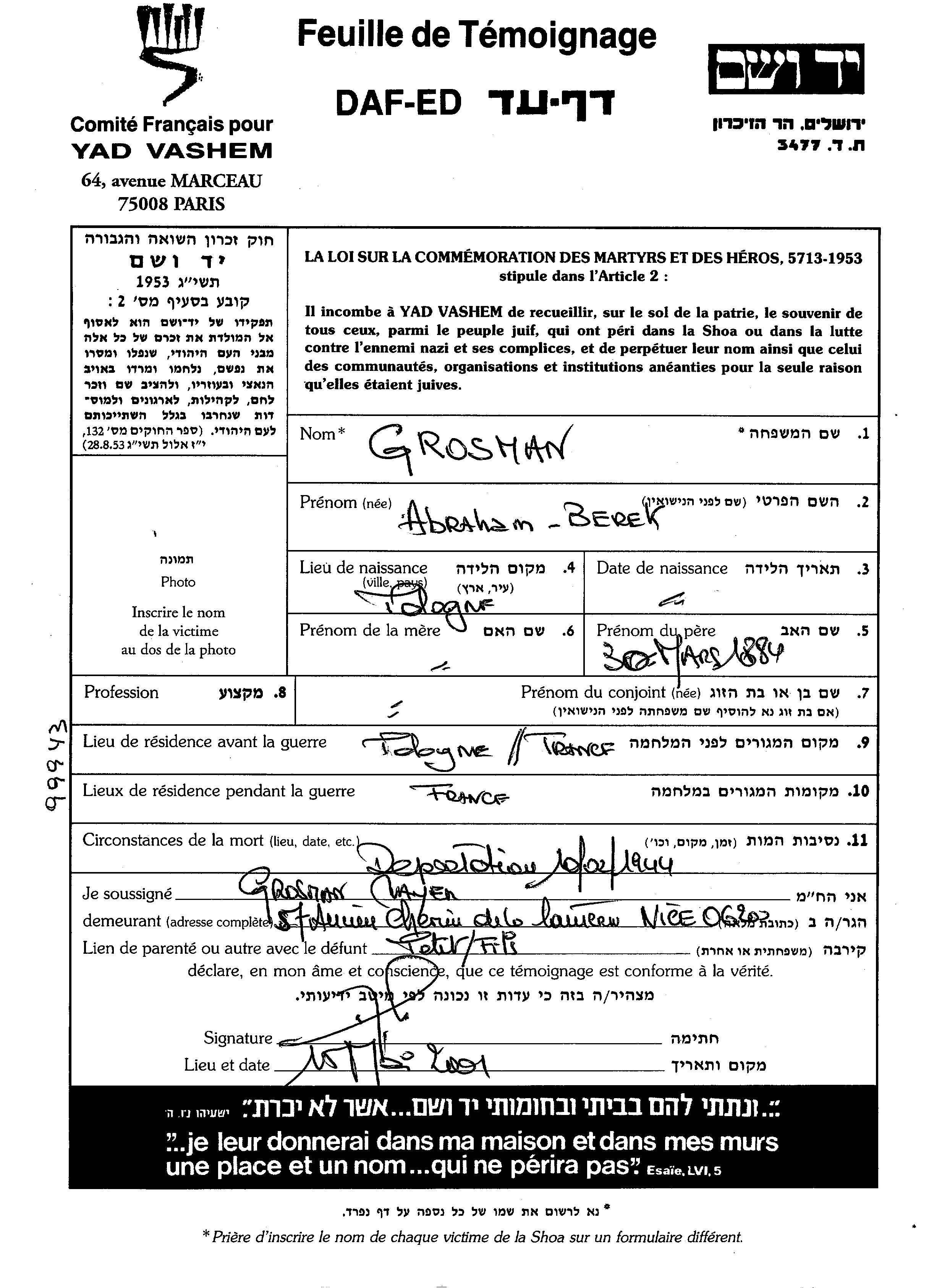 Abraham Berek Grosman wurde im Jahr 1884 in Polen geboren. Vor dem Zweiten Weltkrieg lebte er in Frankreich. Während des Krieges war er in Frankreich.
