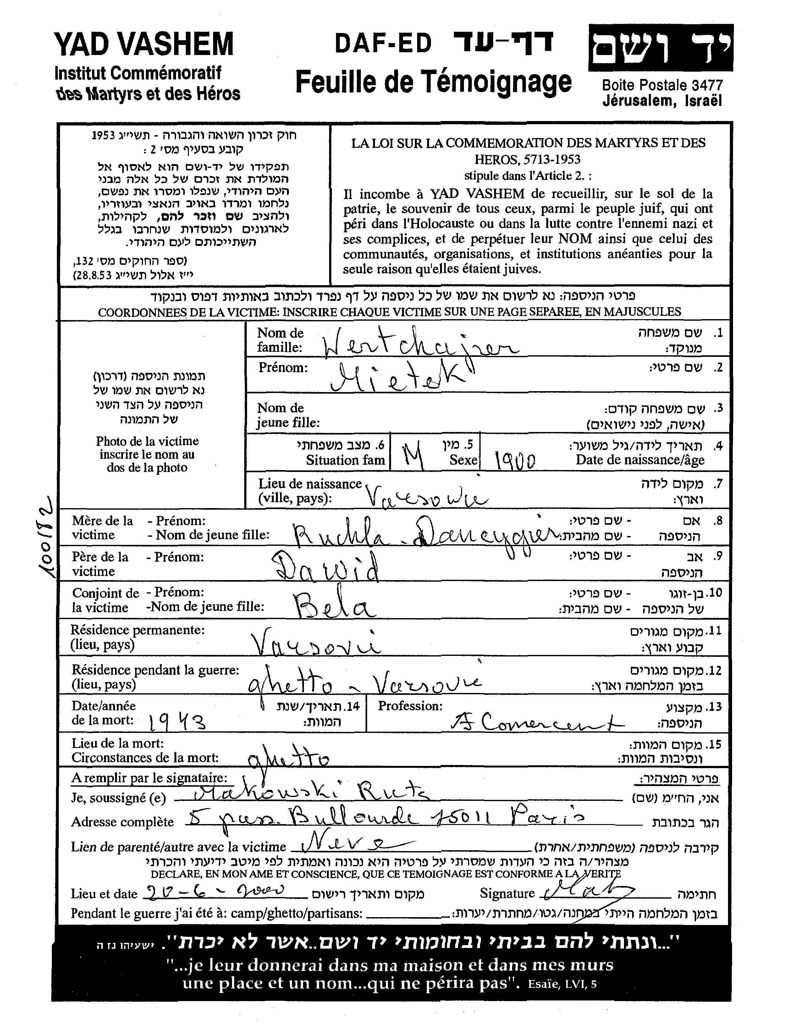 Mielek Werthajzer wurde im Jahr 1900 in Varsovie, Polen geboren. Er war der Sohn von Dawid und Ruchla. Er war Kaufmann/-frau. Vor dem Zweiten Weltkrieg lebte er in Varsovie, Polen. Während des Krieges war er in Varsovie, Polen.