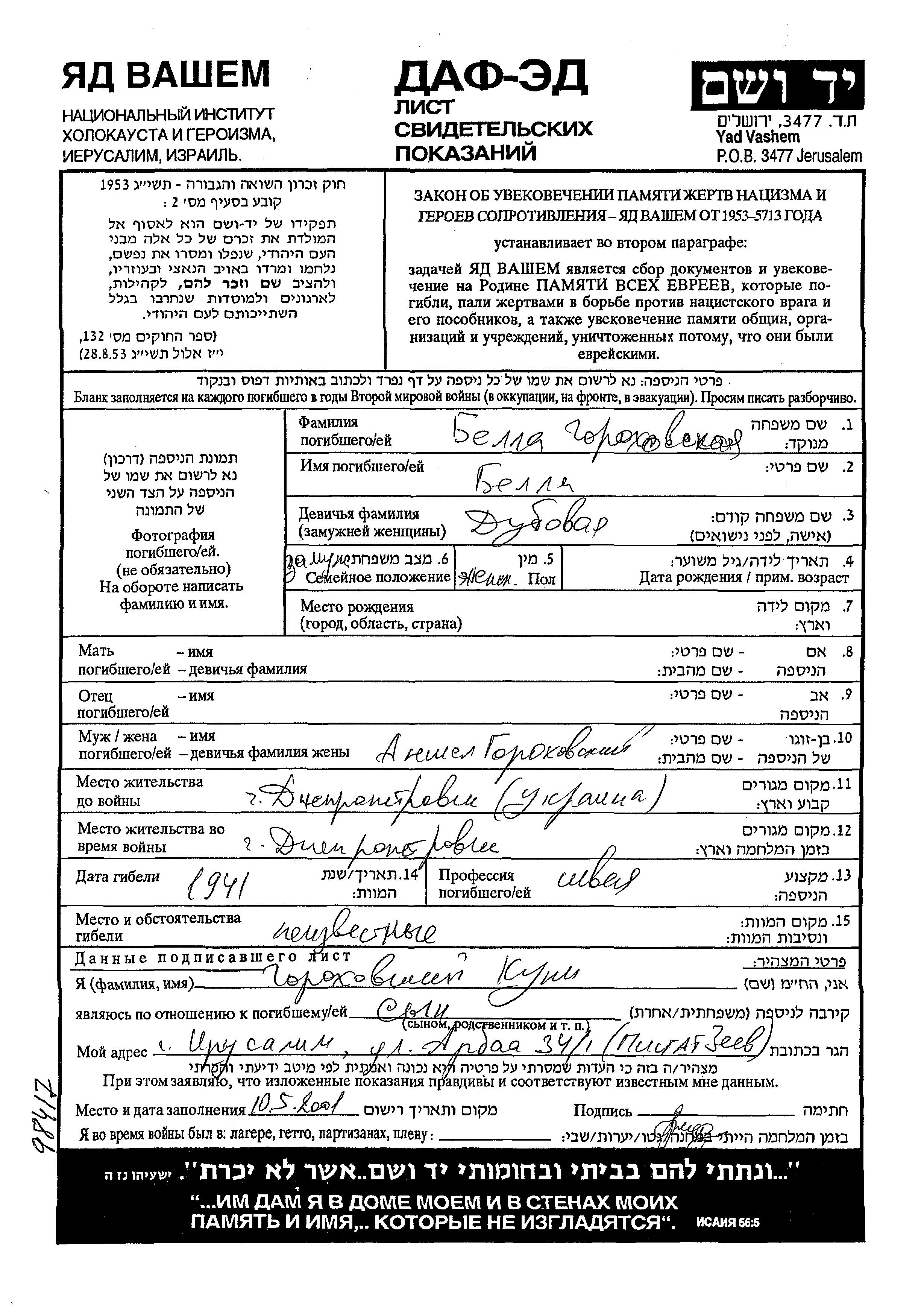 Bella Gorokhovskaya, geb. Dubovaya. Sie war Schneiderin und mit Anshel Verheiratet. Vor dem Zweiten Weltkrieg lebte sie in Dnepropetrovsk, Ukraine (UdSSR). Während des Krieges war sie in Dnepropetrovsk, Ukraine (UdSSR).