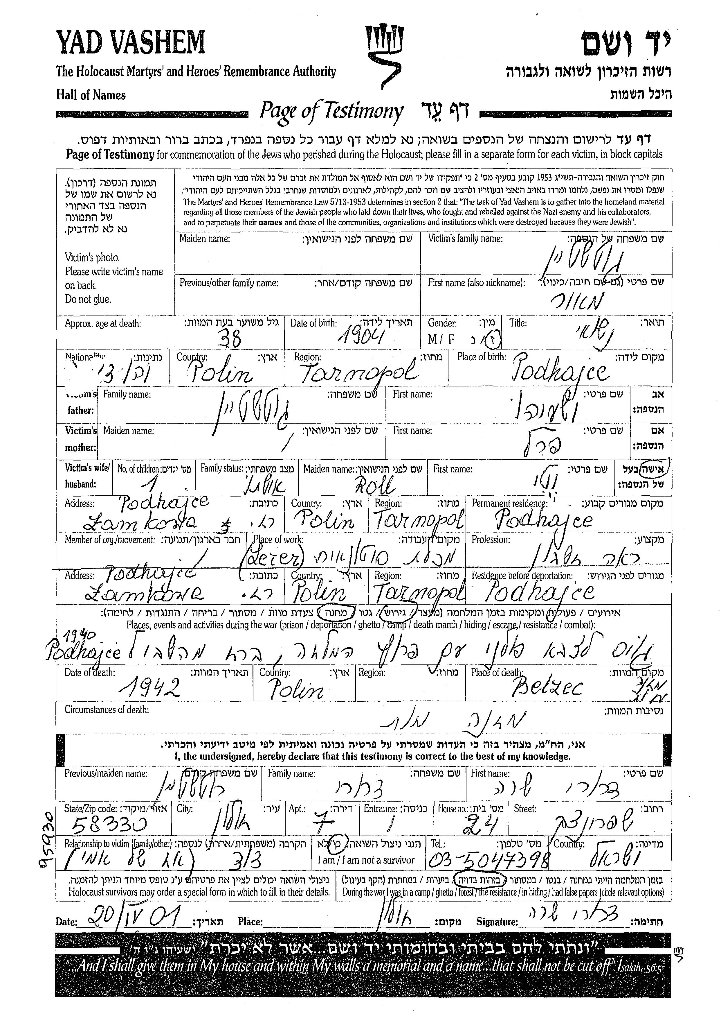 Meir Gotshtein wurde im Jahr 1904 in Podhajce, Polen geboren. Er war der Sohn von Yeshayahu und Perel. Er war Wirtschaftsprüfer/-in und mit Veti, geb. Roll Verheiratet. Vor dem Zweiten Weltkrieg lebte er in Podhajce, Polen. Während des Krieges war er in Podhajce, Polen.