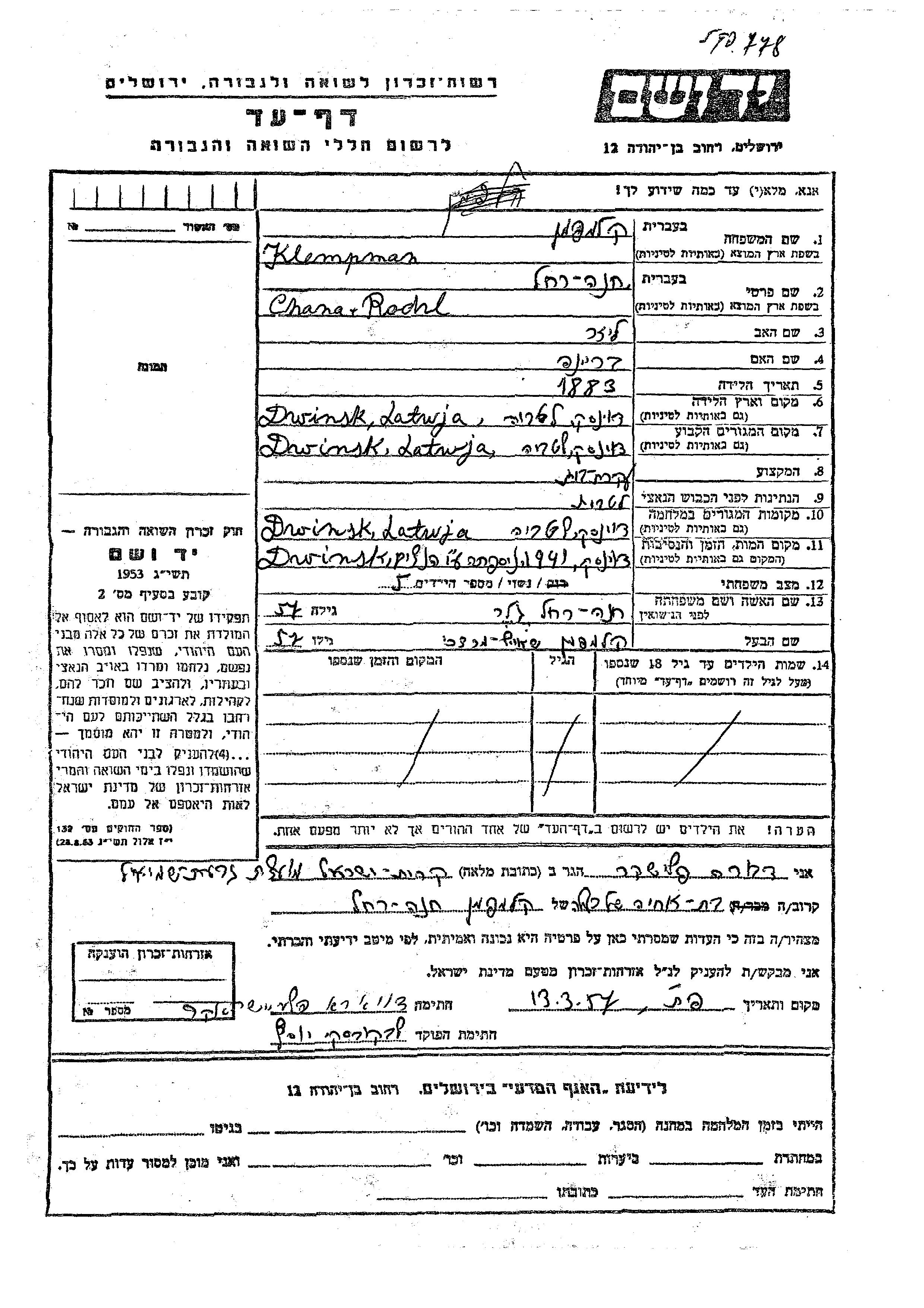 Chana Rachl Klempman, geb. Geler wurde im Jahr 1883 in Dwinsk, Lettland geboren. Sie war die Tochter von Eliezer und Breina. Sie war Hausfrau und mit Shaul Mordekhai Verheiratet. Vor dem Zweiten Weltkrieg lebte sie in Dwinsk, Lettland. Während des Krieges war sie in Dwinsk, Lettland.