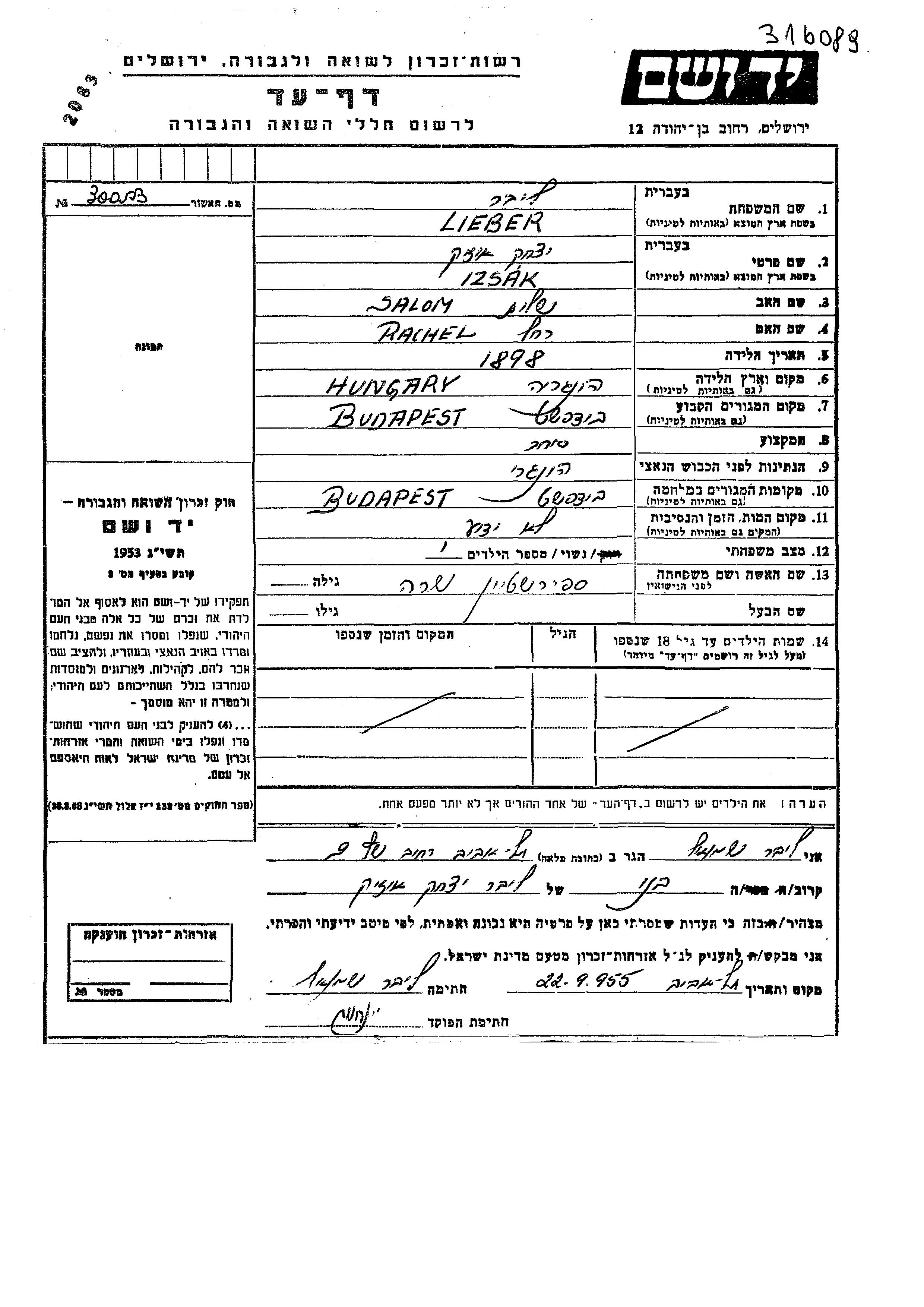 Izsak Lieber Liber wurde im Jahr 1898 in Ungarn geboren. Er war der Sohn von Shalom und Rachel. Er war Kaufmann/-frau und mit Sara, geb. Safirshtein Verheiratet. Vor dem Zweiten Weltkrieg lebte er in Budapest, Ungarn. Während des Krieges war er in Budapest, Ungarn.
