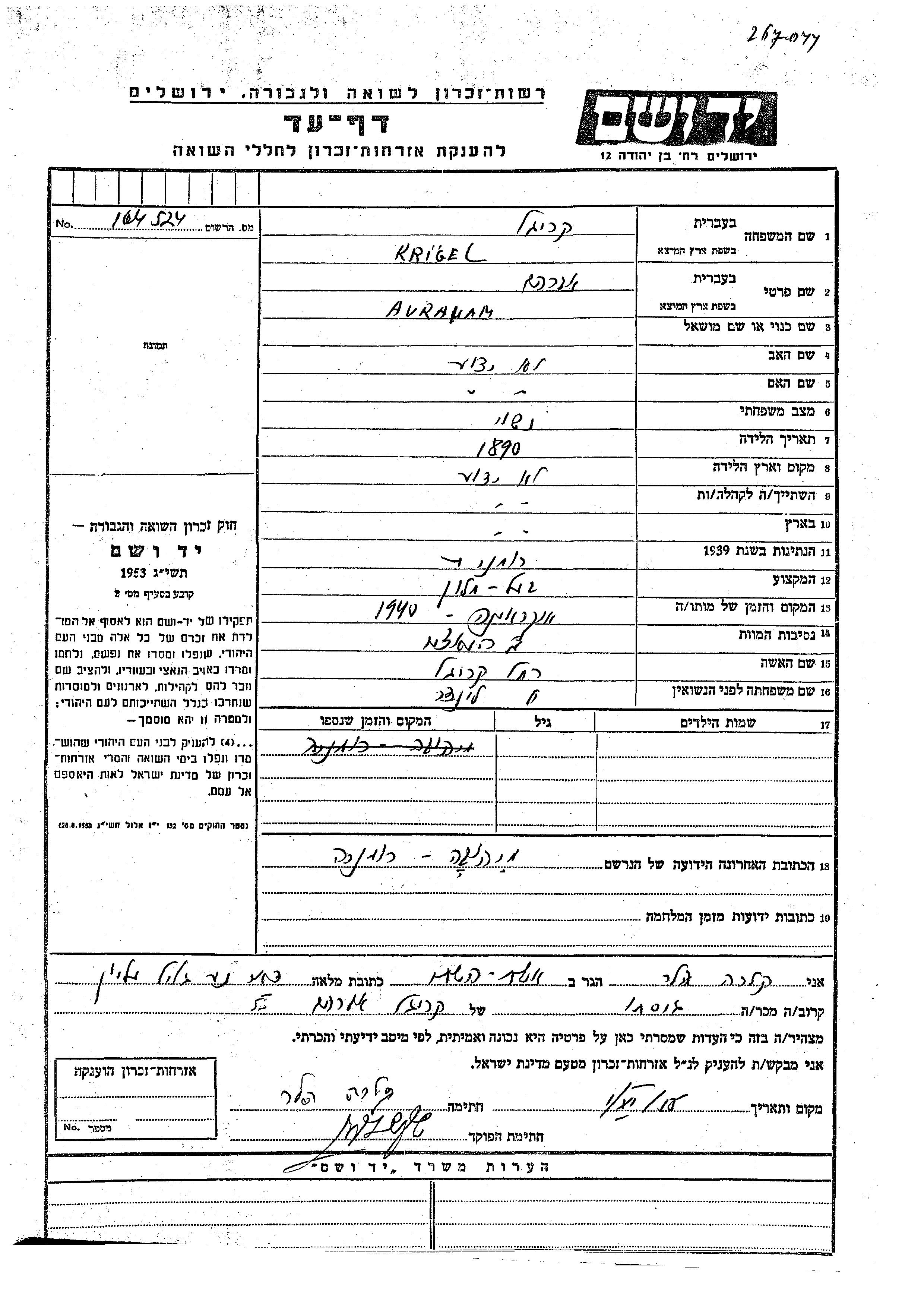 Avraham Krigel wurde im Jahr 1890 geboren. Er war Hotelinhaber. Während des Krieges war er in Mihova, Rumänien.