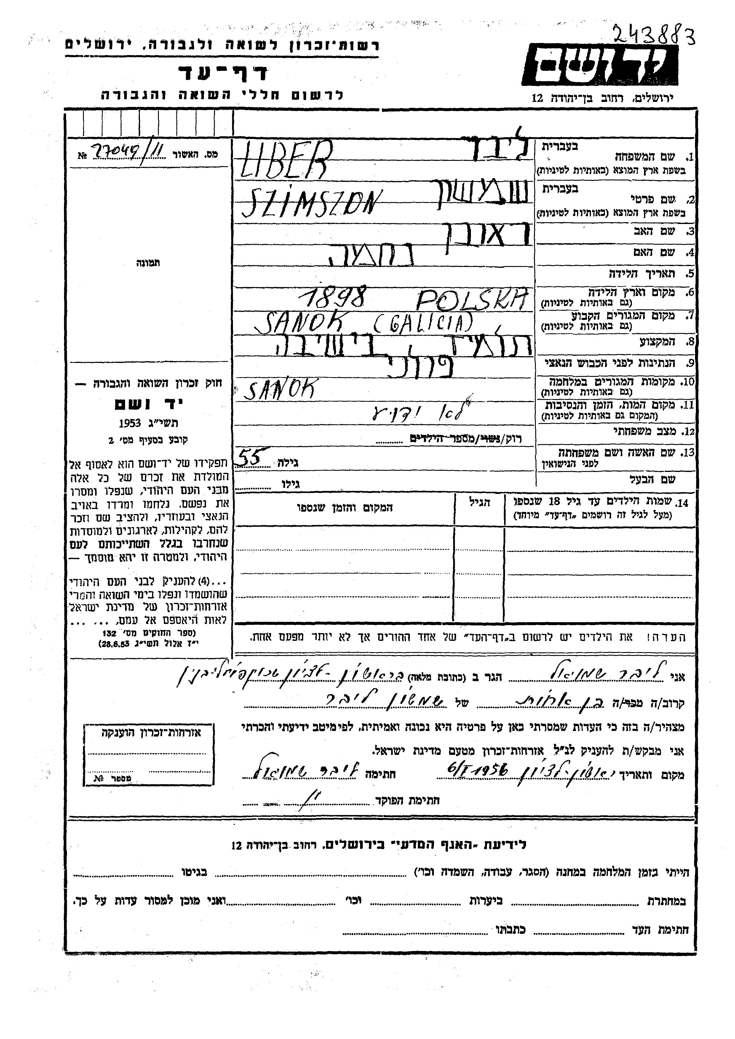 Szimszon Liber wurde in Polen geboren. Er war der Sohn von Reuven und Nekhama. Er war Jeschiwahschüler und Ledig. Vor dem Zweiten Weltkrieg lebte er in Sanok, Polen. Während des Krieges war er in Sanok, Polen.