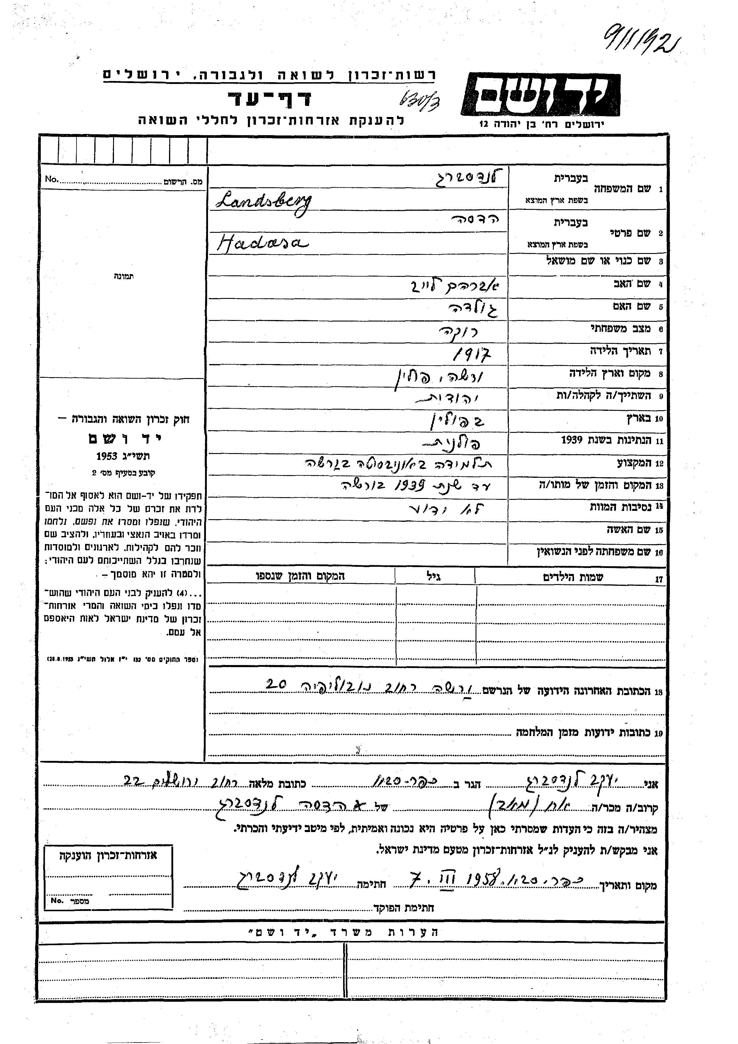 Hadasa Landsberg wurde im Jahr 1917 in Warsaw, Polen geboren. Sie war die Tochter von Avraham Leib und Golda. Sie war Schüler/-in.