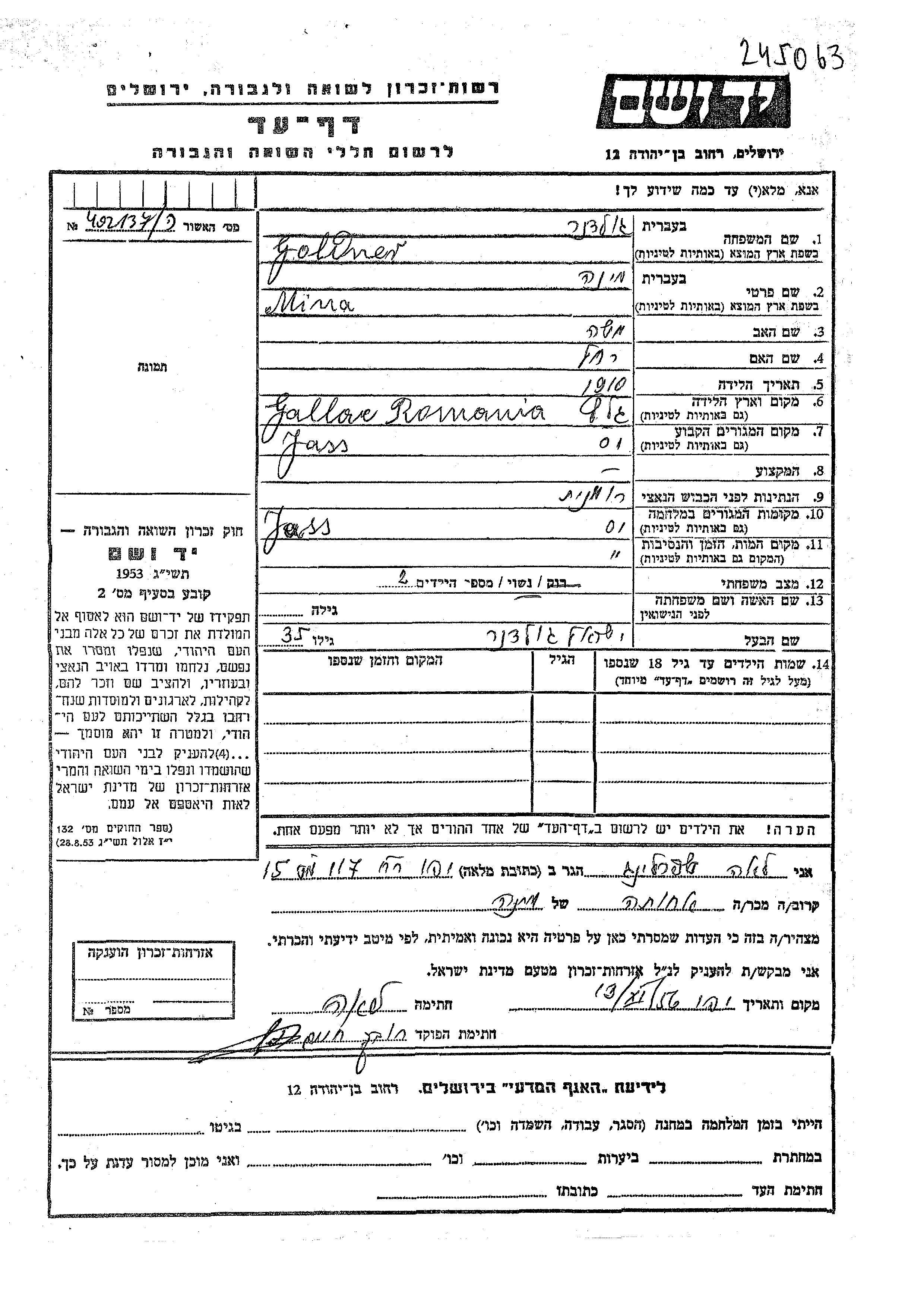 Mina Goldner wurde im Jahr 1910 in Galac, Rumänien geboren. Sie war die Tochter von Moshe und Rakhel. Sie war mit Yisrael Verheiratet. Vor dem Zweiten Weltkrieg lebte sie in Jasi, Rumänien. Während des Krieges war sie in Jasi, Rumänien.