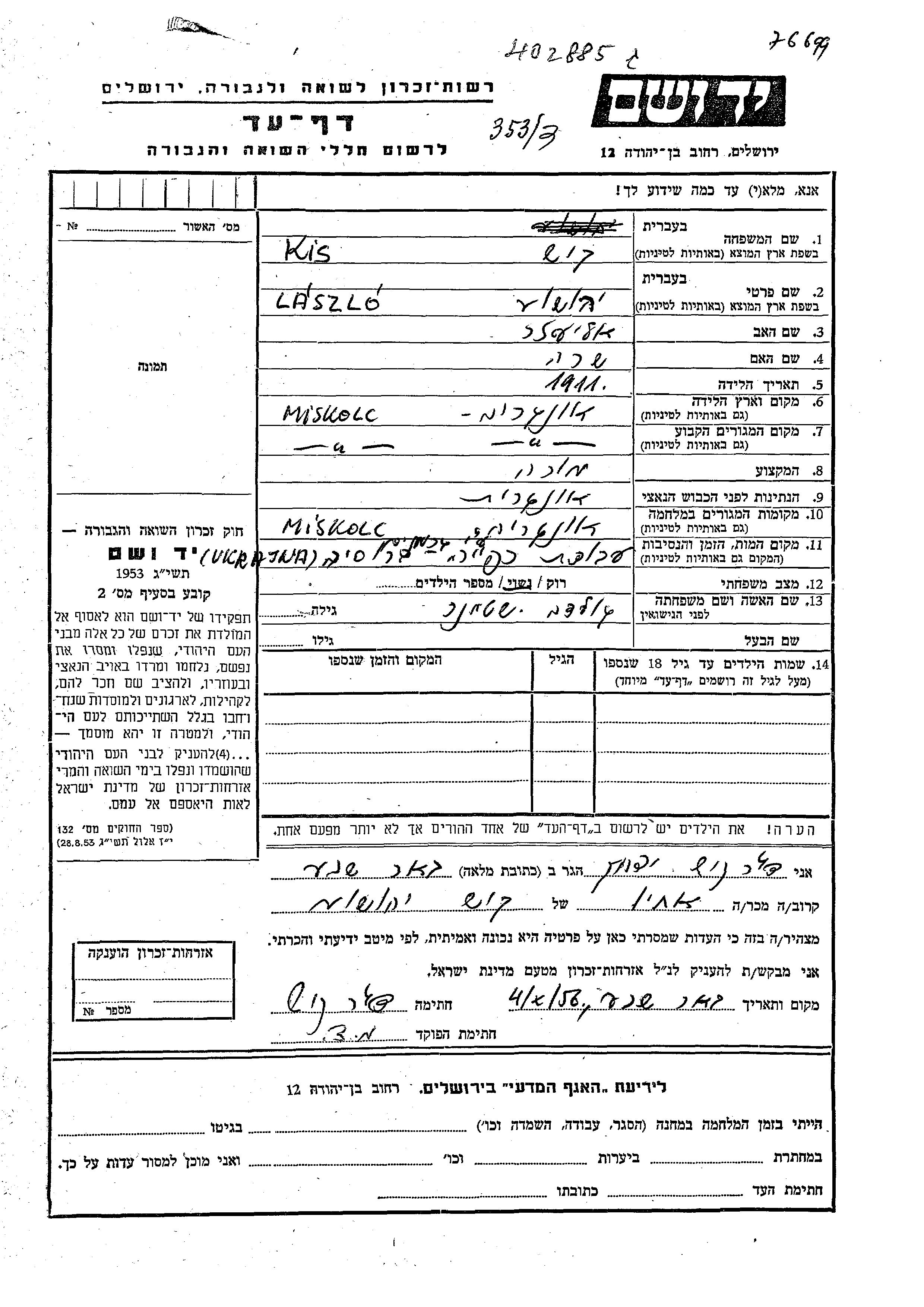 Laszlo Yehoshua Kis wurde im Jahr 1911 in Miskolc, Ungarn geboren. Er war der Sohn von Eliezer und Sara. Er war Lehrer/in und mit Golda, geb. Shteiner Verheiratet. Vor dem Zweiten Weltkrieg lebte er in Miskolc, Ungarn. Während des Krieges war er in Miskolc, Ungarn.