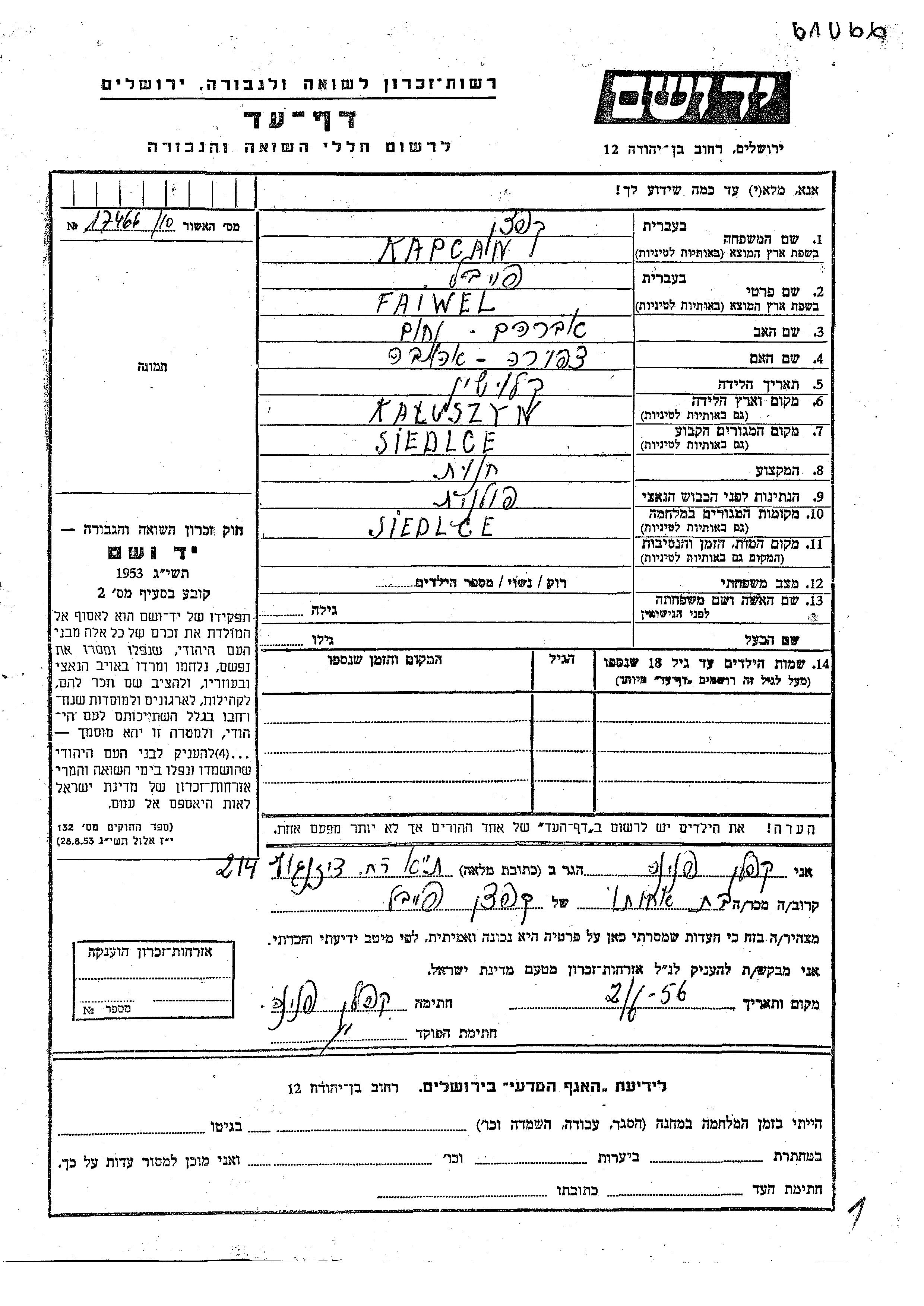Faiwel Kapcan wurde in Kaluszyn, Polen geboren. Er war der Sohn von Avraham Nakhum und Tzipora Ahuva. Vor dem Zweiten Weltkrieg lebte er in Siedlce, Polen. Während des Krieges war er in Siedlce, Polen.