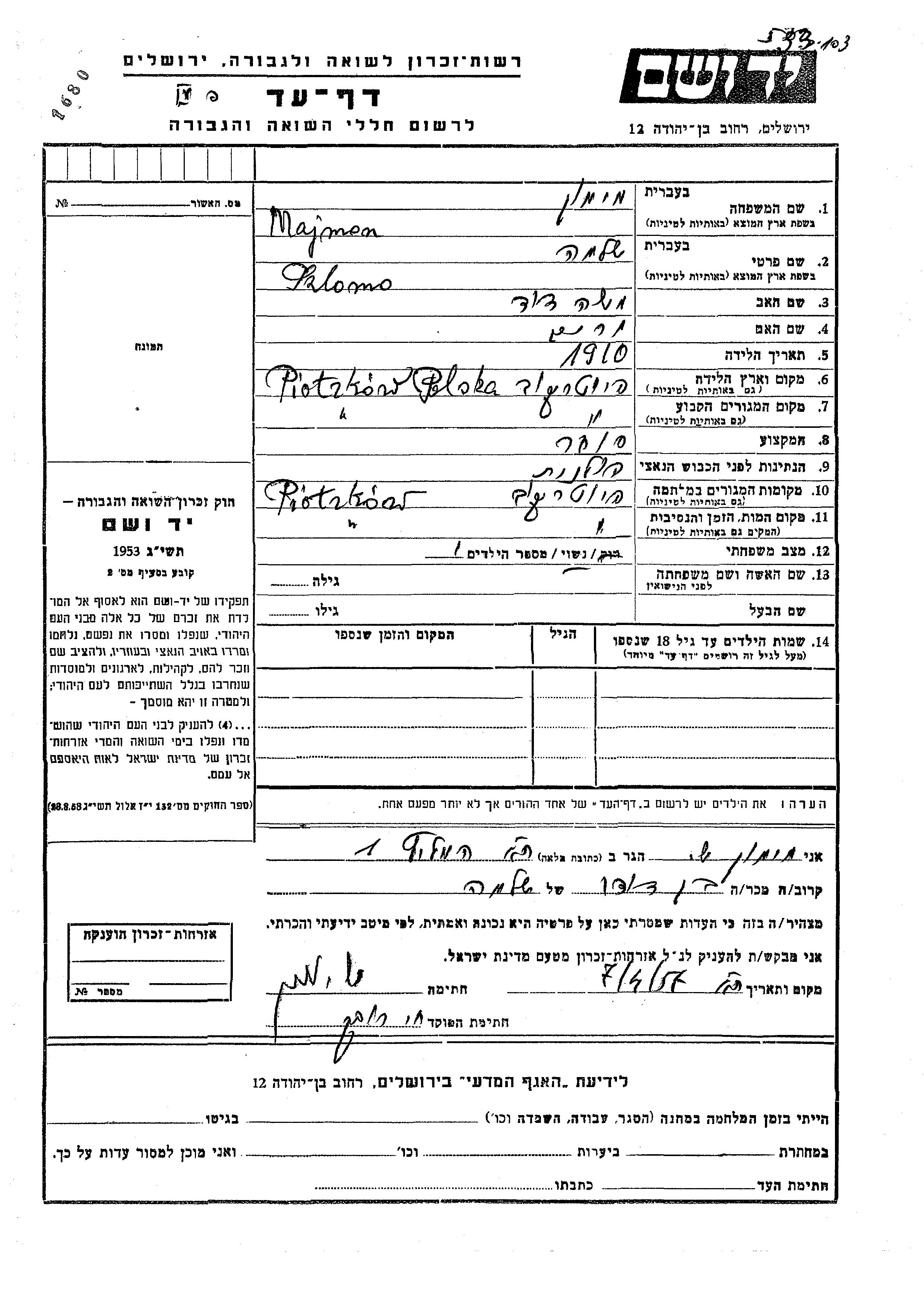 Szlomo Majmon wurde im Jahr 1910 in Piotrkow, Polen geboren. Er war der Sohn von Moshe David und Miriam. Er war Kaufmann/-frau und Verheiratet. Vor dem Zweiten Weltkrieg lebte er in Piotrkow, Polen. Während des Krieges war er in Piotrkow, Polen.
