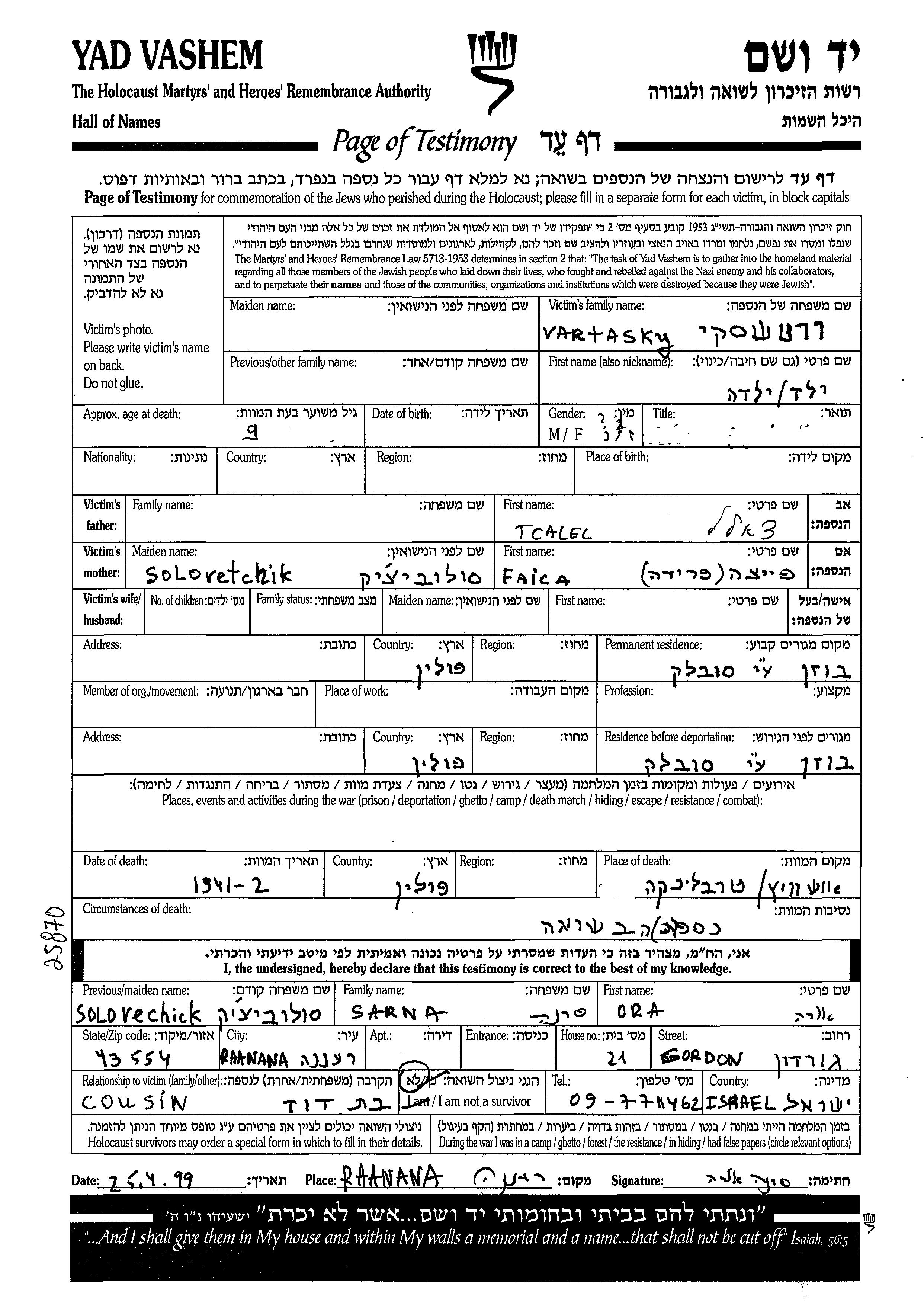 Vorname unbekannt Vartasky Vartashski wurde Er/sie war der/ die Sohn/Tochter von Tcalel und Faica Frida. Er/Sie war Kind. Vor dem Zweiten Weltkrieg er/sie in Vizan, Polen. Während des Krieges war er/sie in Vizan, Polen.