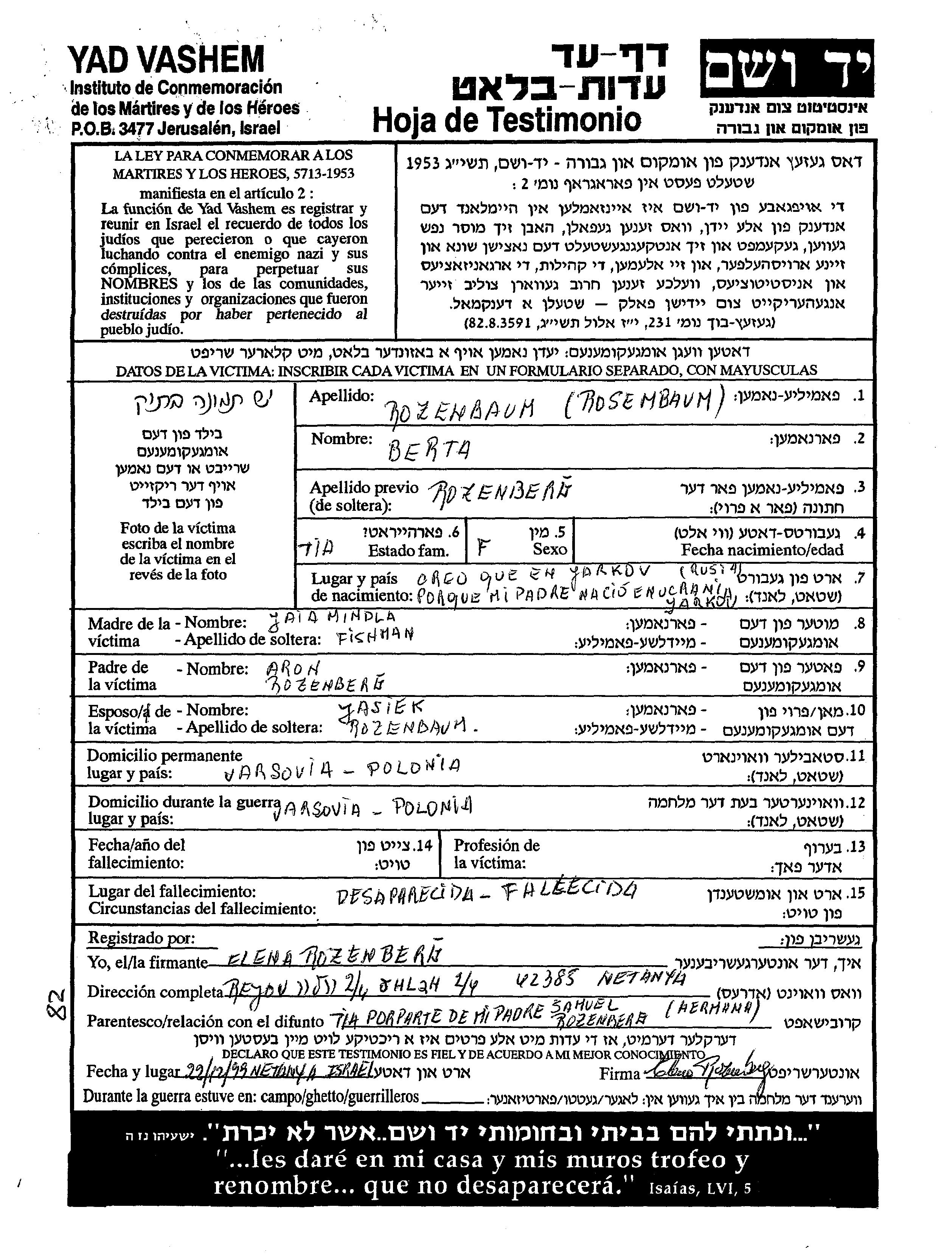 Rozenbaum Berta Varsha, Polen Gedenkblatt