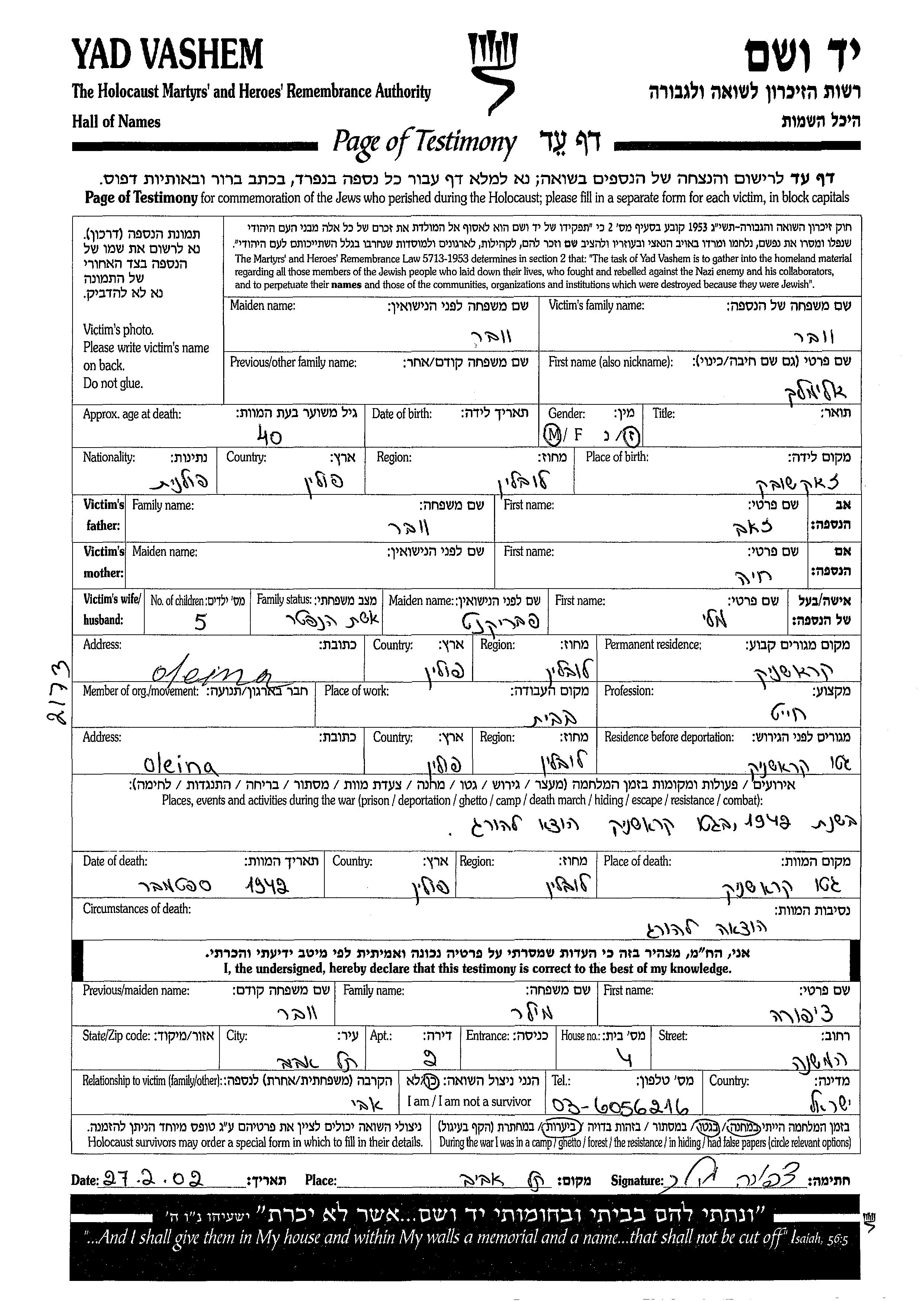 Elimelekh Veber wurde in Zakszowek, Polen geboren. Er war der Sohn von Zeev und Khaia. Er war Schneider und mit Mali, geb. Fabrikant Verheiratet. Vor dem Zweiten Weltkrieg lebte er in Krasznik, Polen. Während des Krieges war er in Krasznik, Polen.