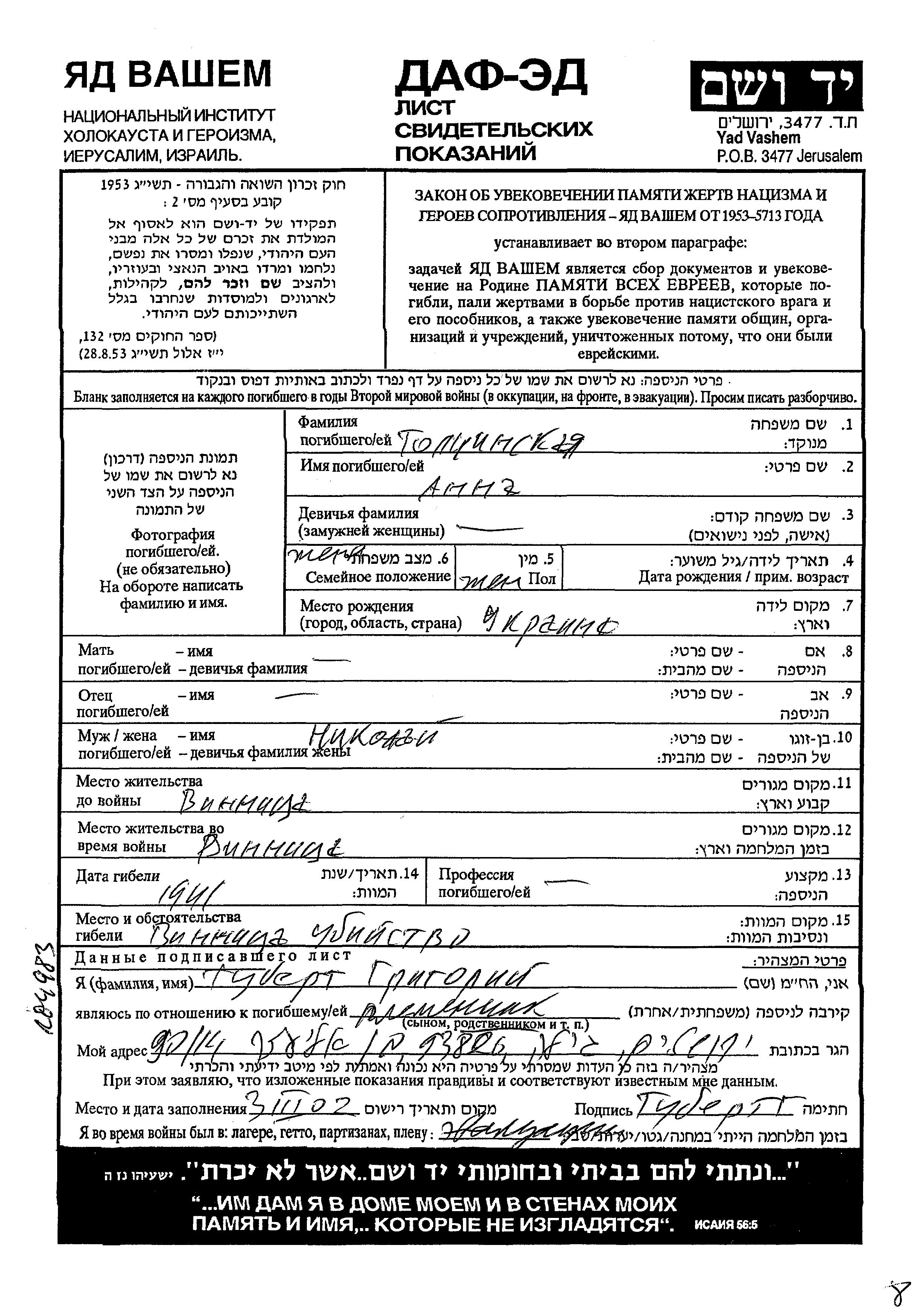 Anna Tolchinskaya wurde in Ukraine (UdSSR) geboren. Sie war mit Nikolai Verheiratet. Vor dem Zweiten Weltkrieg lebte sie in Vinnitsa, Ukraine (UdSSR). Während des Krieges war sie in Vinnitsa, Ukraine (UdSSR).