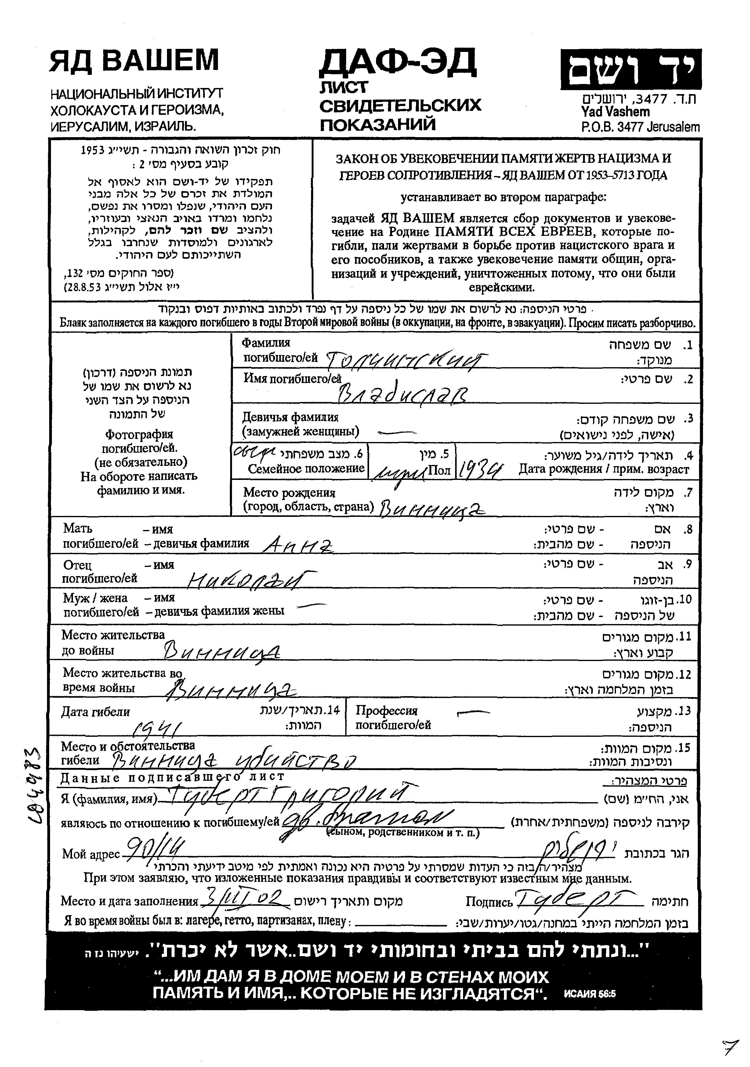 Vladislav wurde in der Schoah ermordet. Todesort: Vinnitsa, Ukraine (UdSSR) im Jahr 1941.