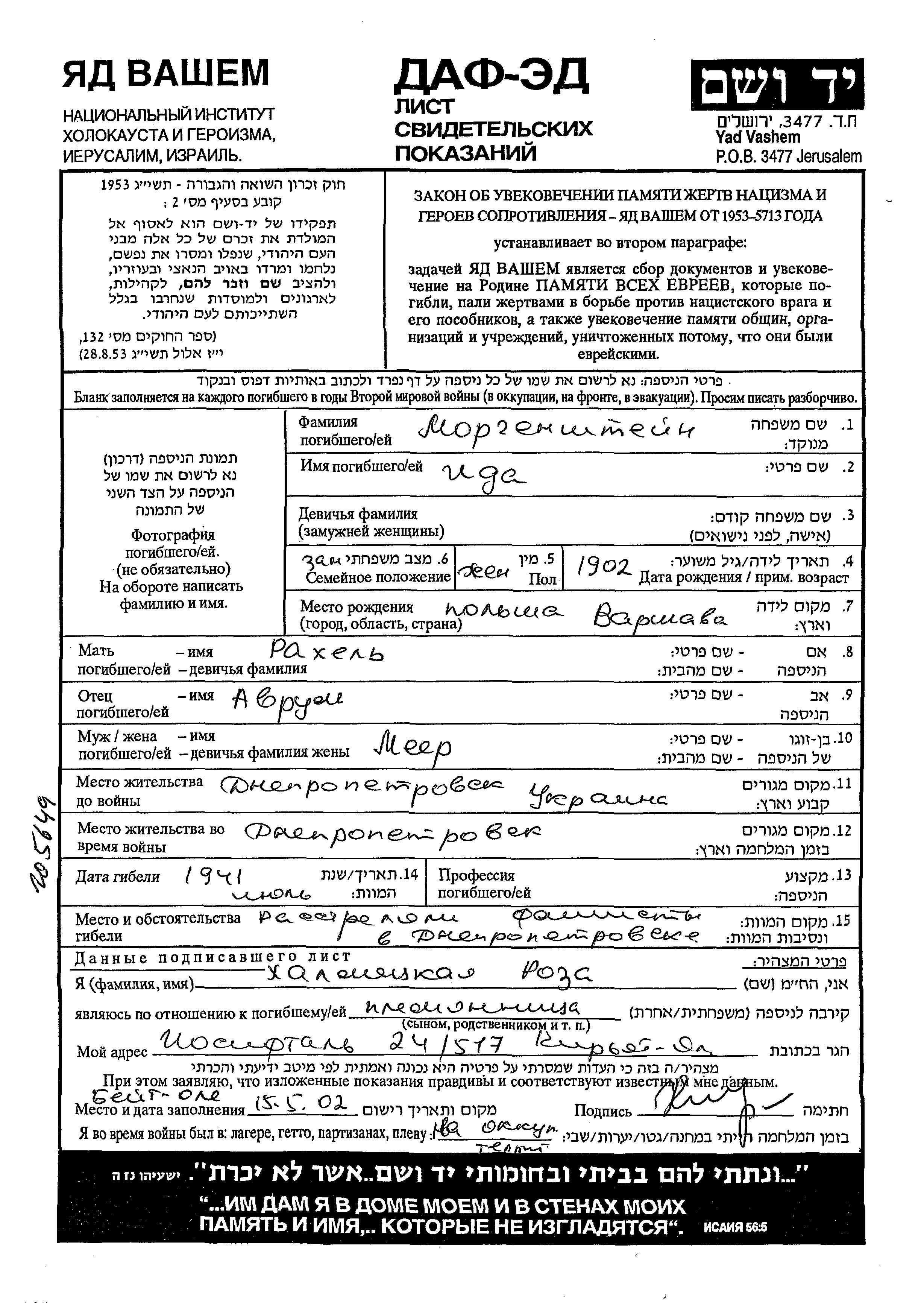 Morgenshtein Ida 1902 Dnepropetrovsk, Ukraine (UdSSR) Gedenkblatt