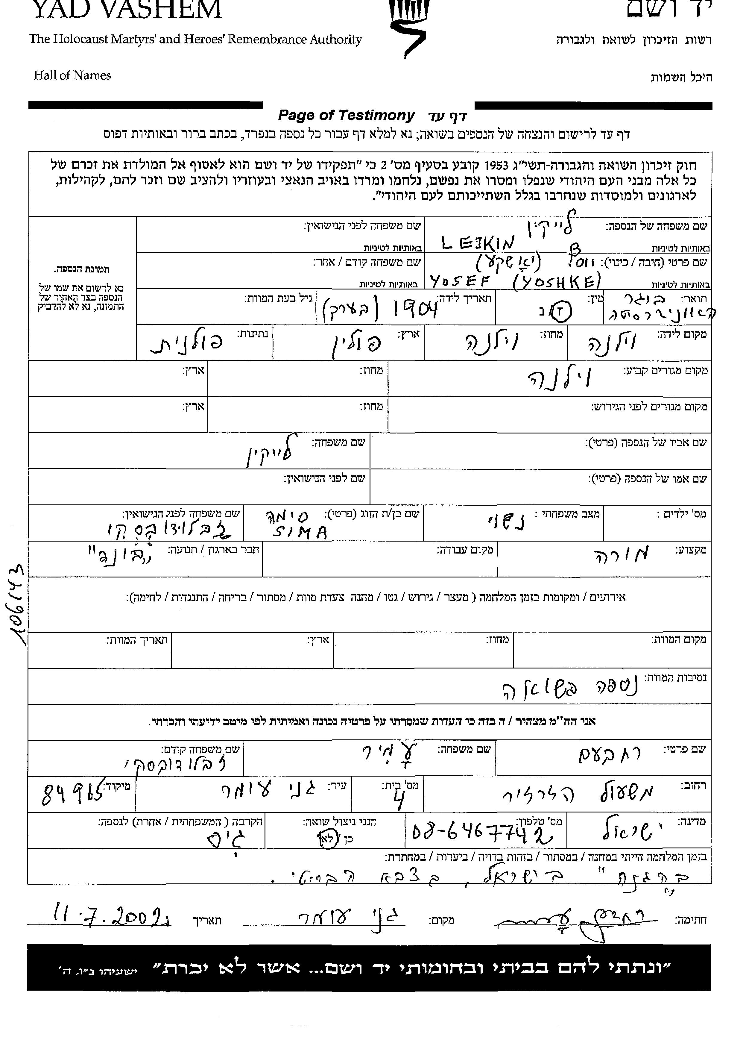 Bakkalaureus Yoshke Lejkin wurde im Jahr 1904 in Wilno, Polen geboren. Er war Lehrer/in und mit Sima, geb. Zabludovski Verheiratet. Vor dem Zweiten Weltkrieg lebte er in Wilno, Polen.